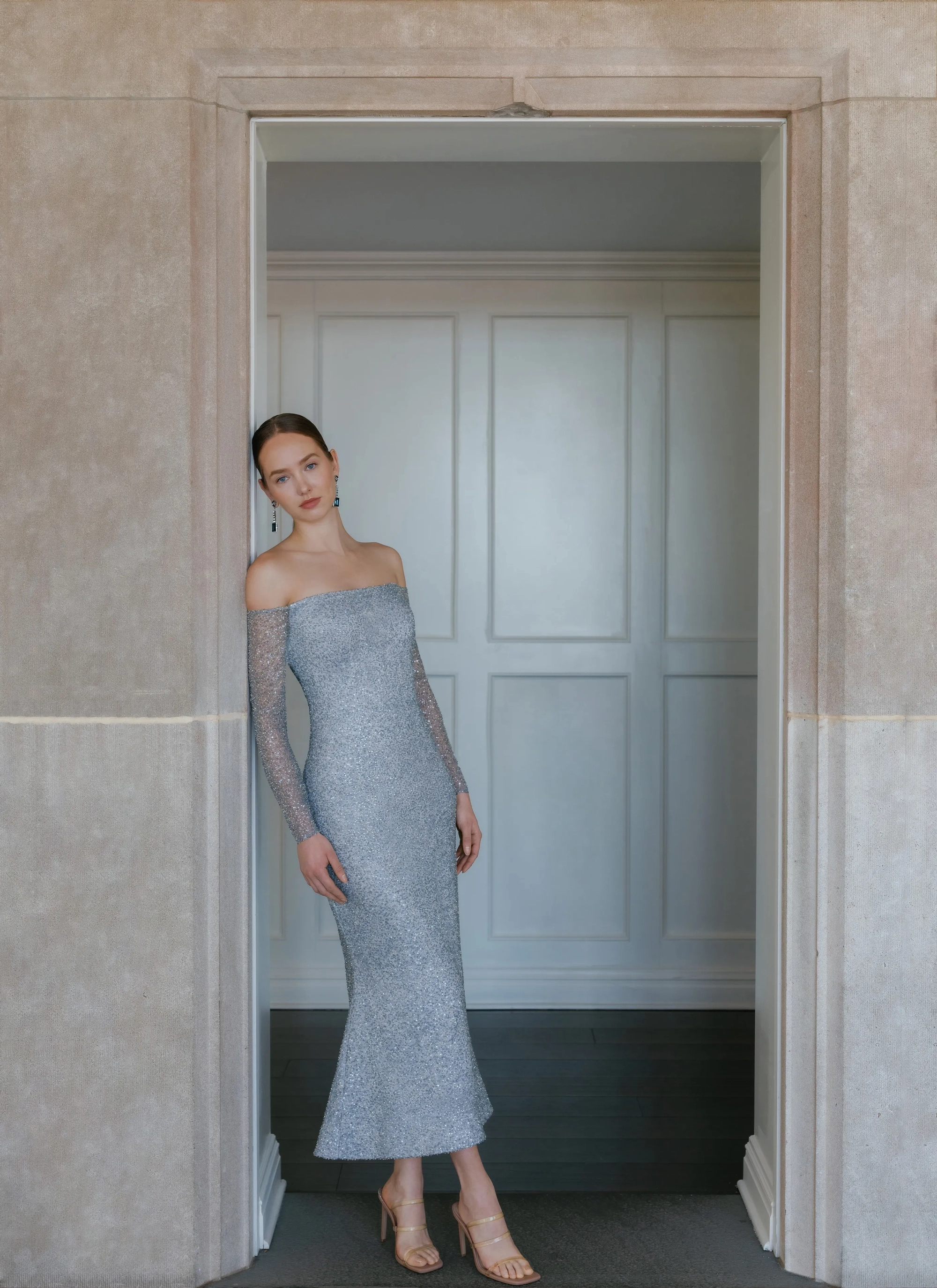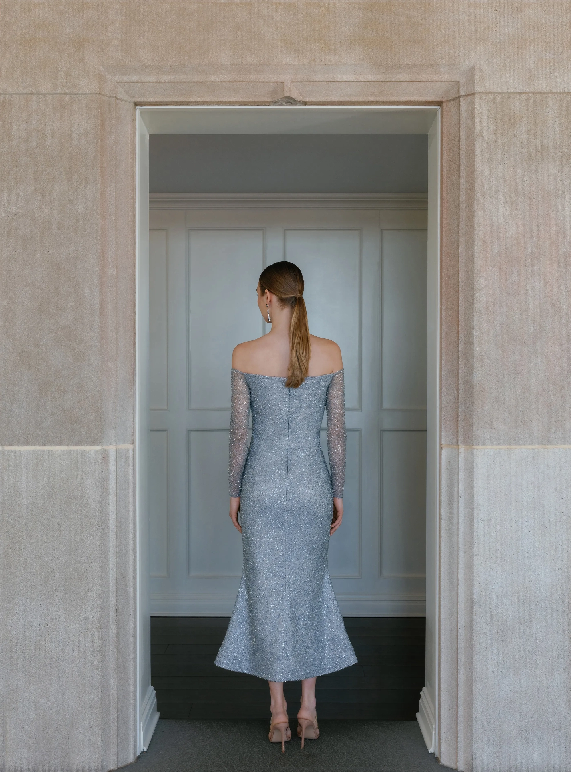 Off-the-shoulder long sleeve slim flare tea length gown.
