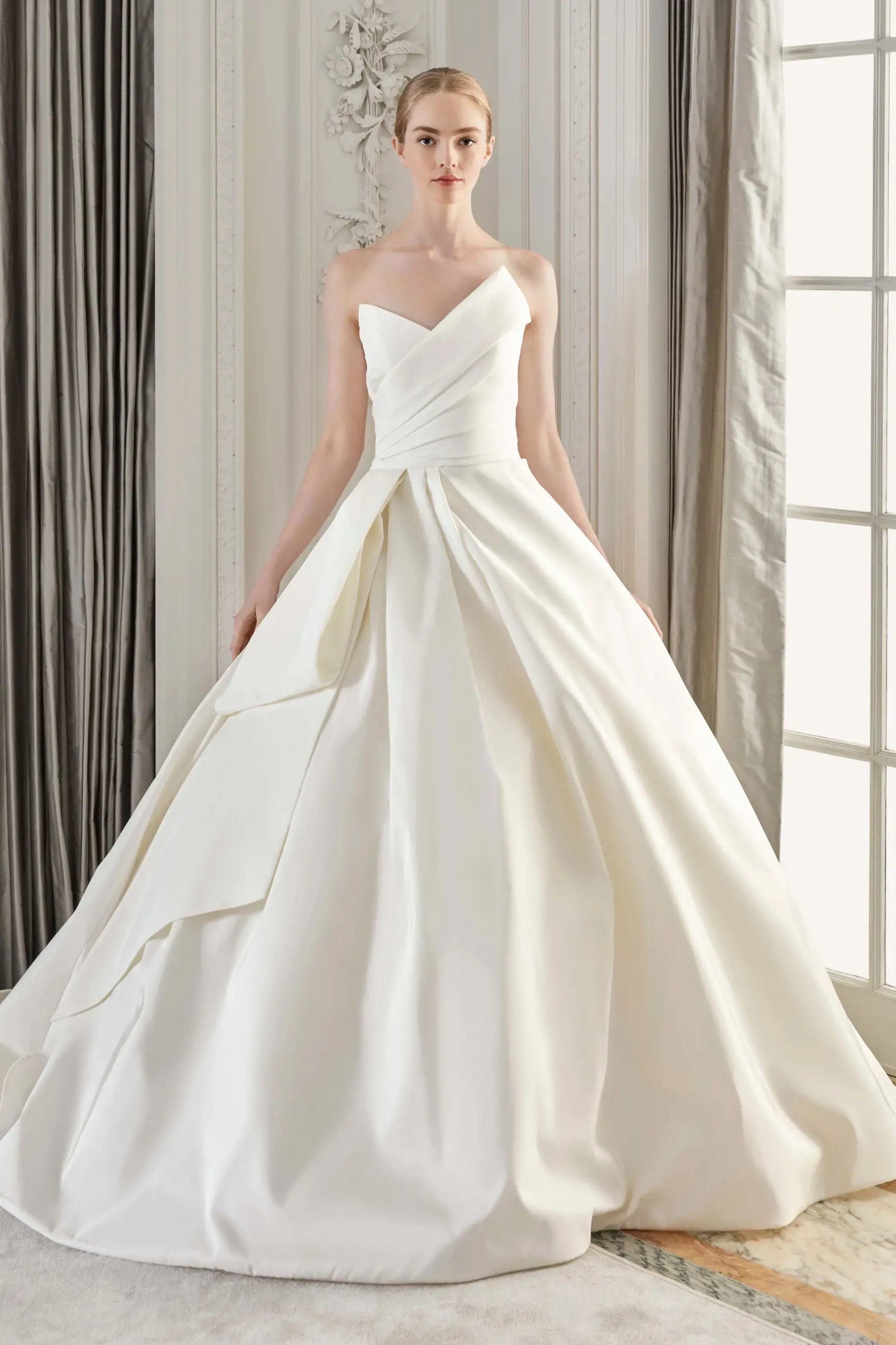 Silk Italian Faille asymmetric neckline draped ballgown with side petal. Shown in Ivory. Only available in Ivory.