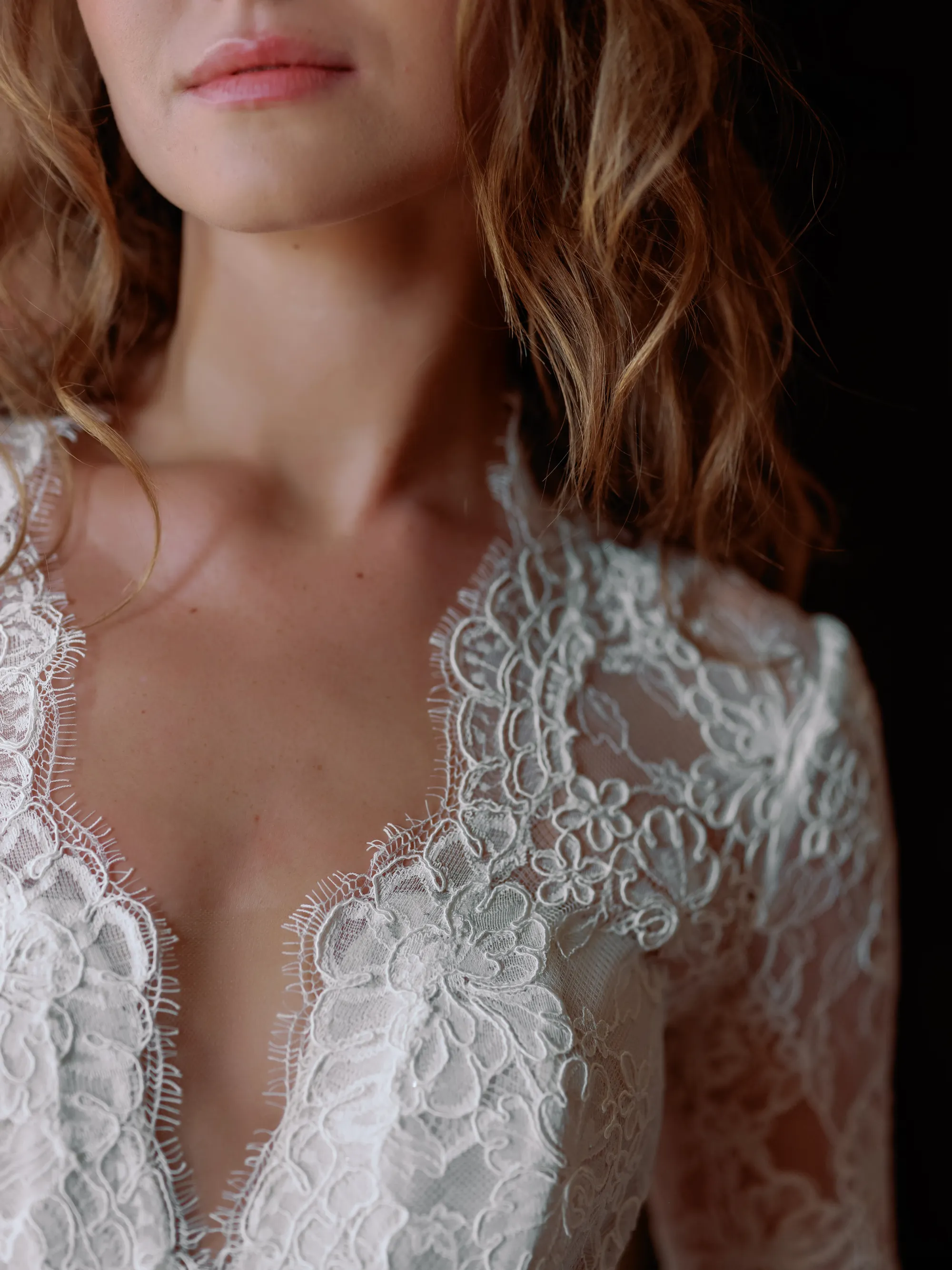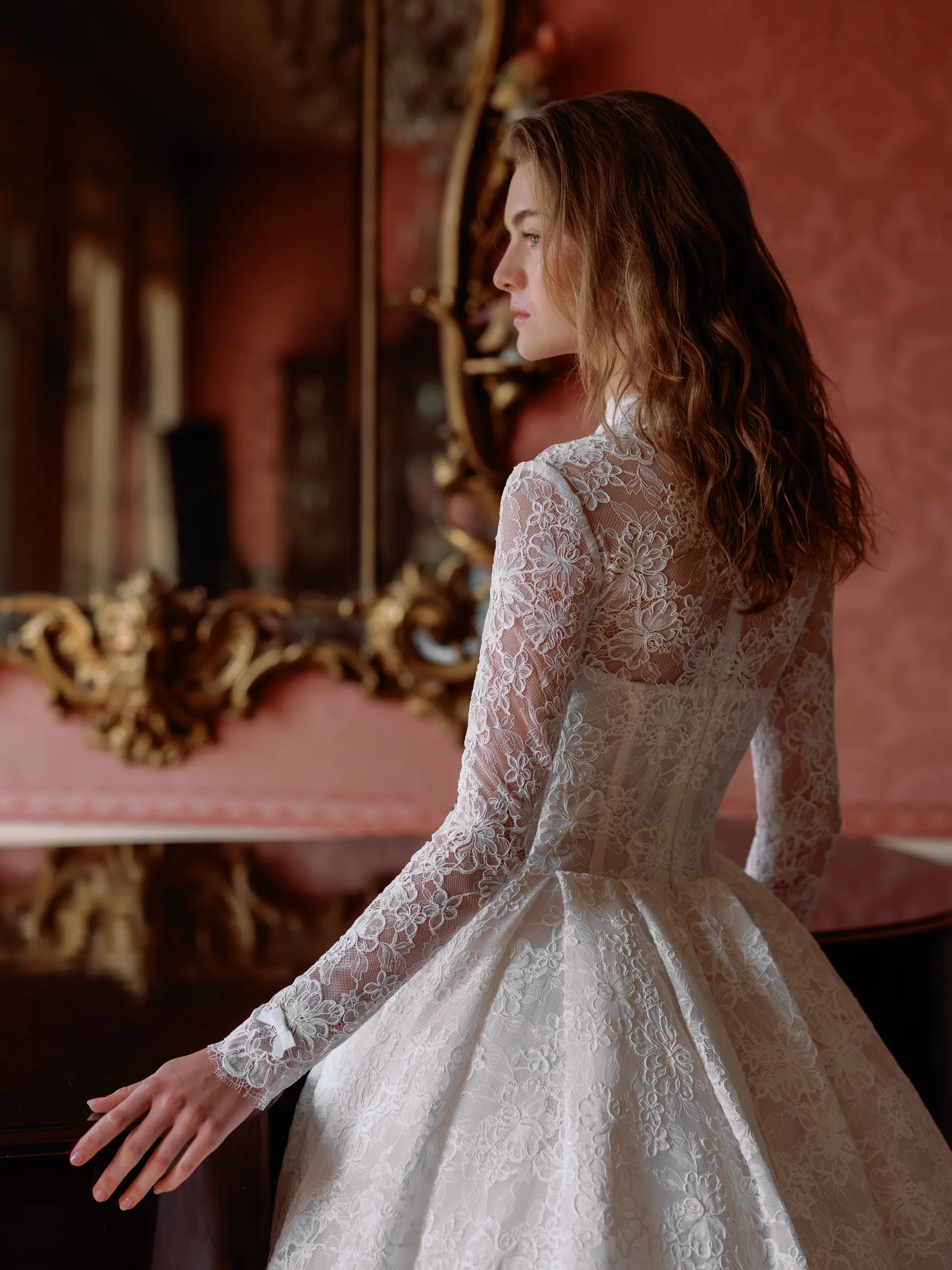V-neck long sleeve basque waist ballgown adorned with handmade petite bows on the front bodice.
