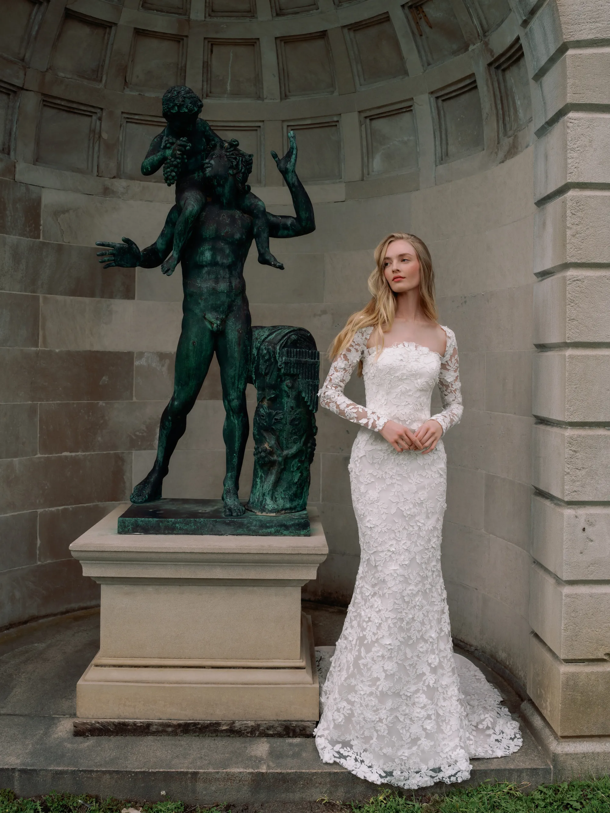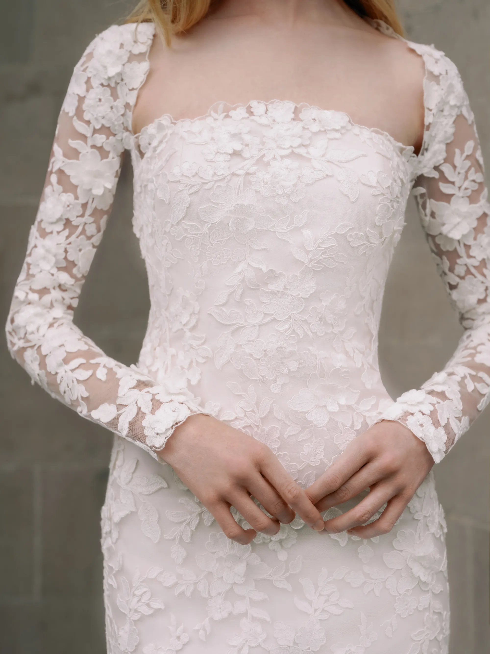Square neckline long sleeve slim flare gown.