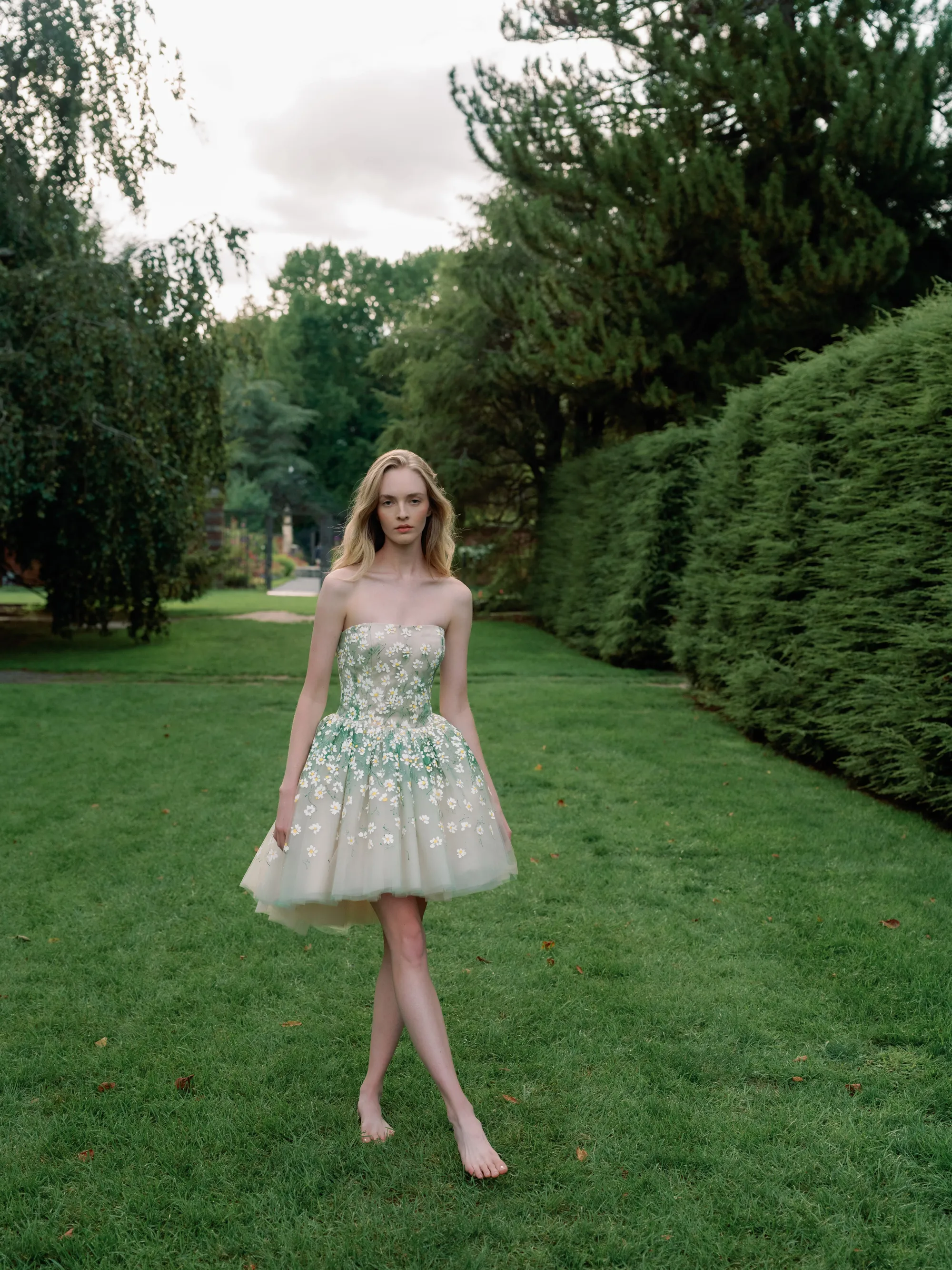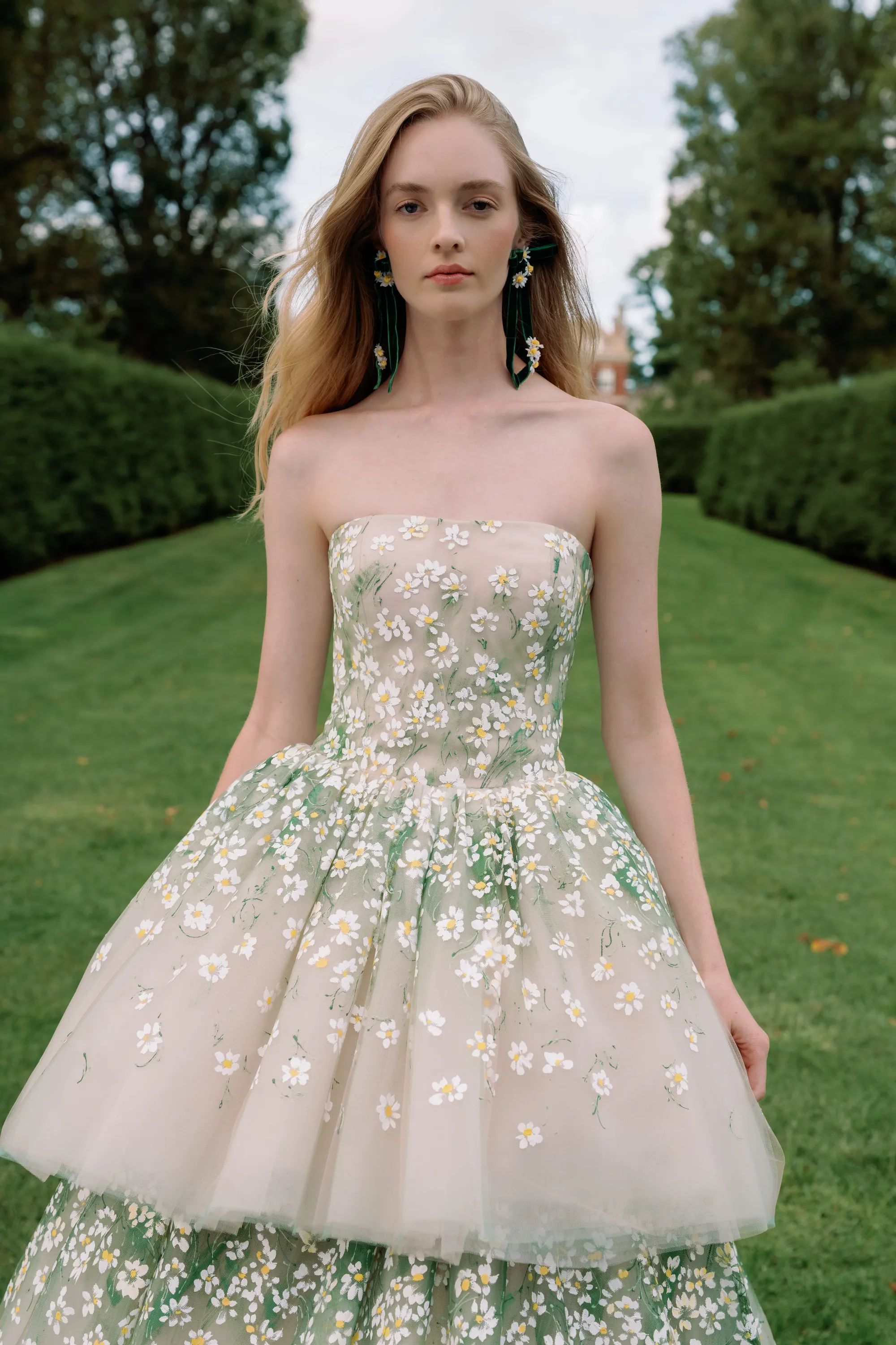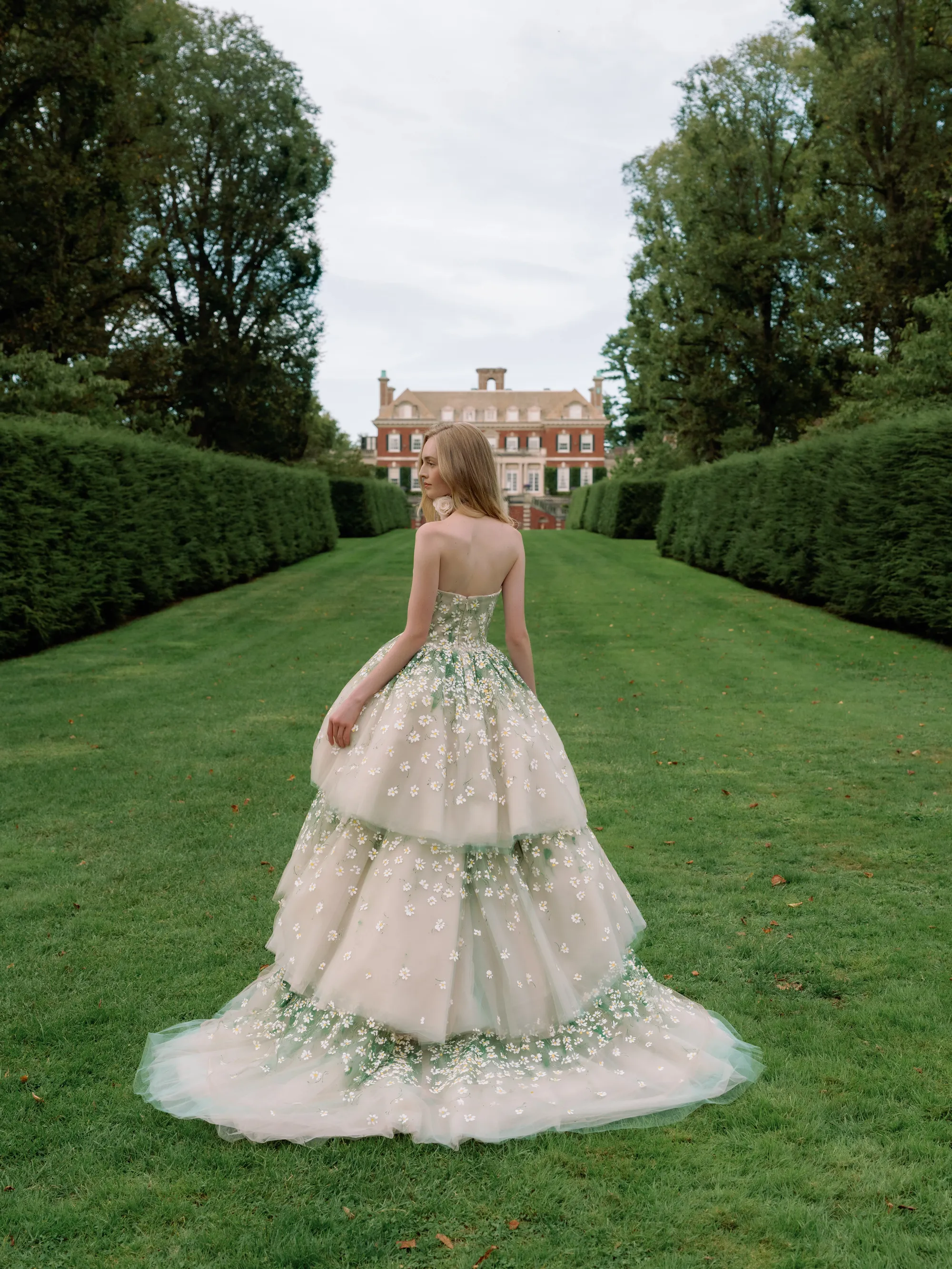 Straight neckline three-tiered ballgown. Detachable underskirt converts gown into a mini dress.
