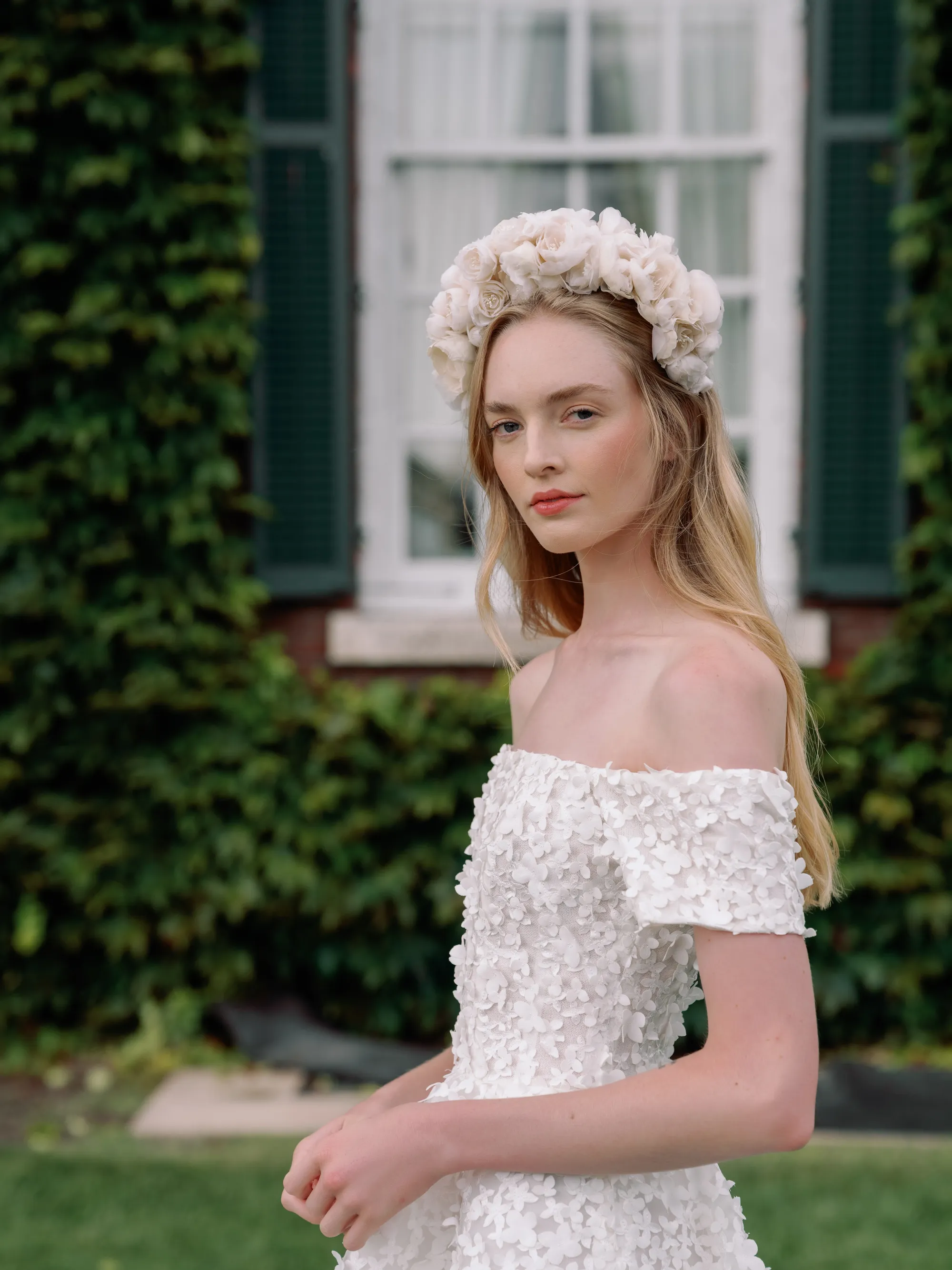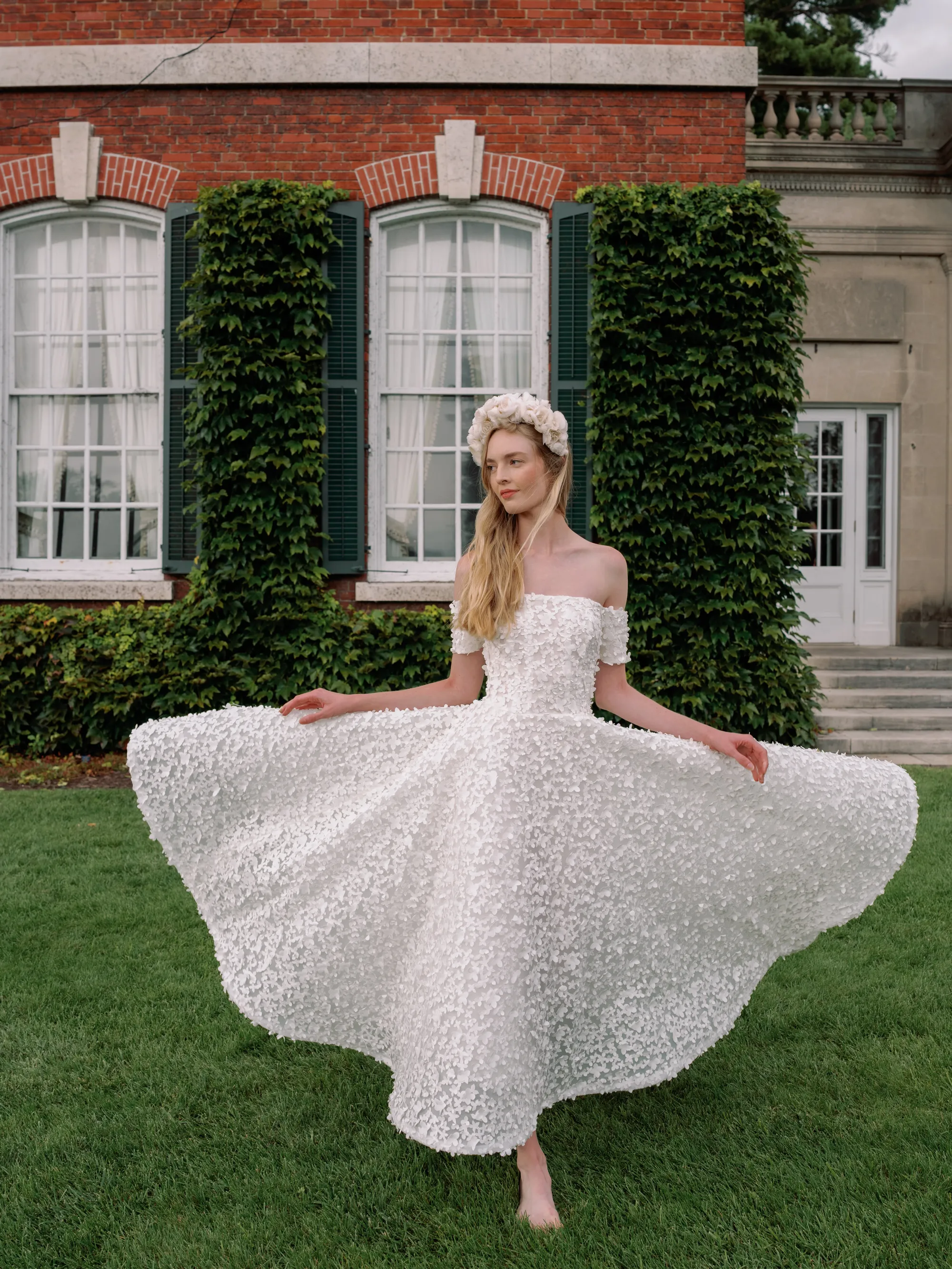Three-dimensional laser cut lace straight neckline with off- the-shoulder sleeves a-line tea length gown.
