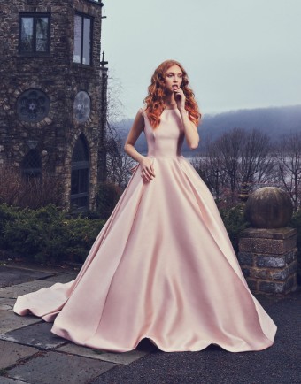 Full ball gown featuring a bateau neckline and U-shape back. Accented with a cathedral length train and detachable bow in back.
