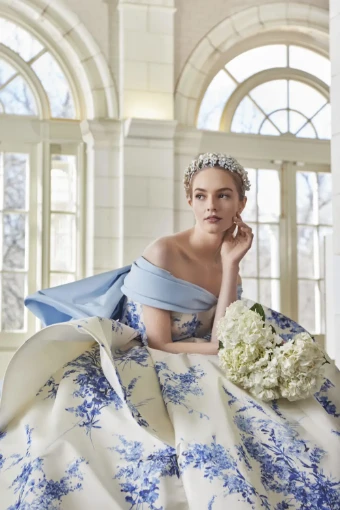 Printed floral duchess satin off the shoulder draped band with watteau petal and oversized ballgown with layered detail. Shown in Ivory/Blue. Available in Ivory.