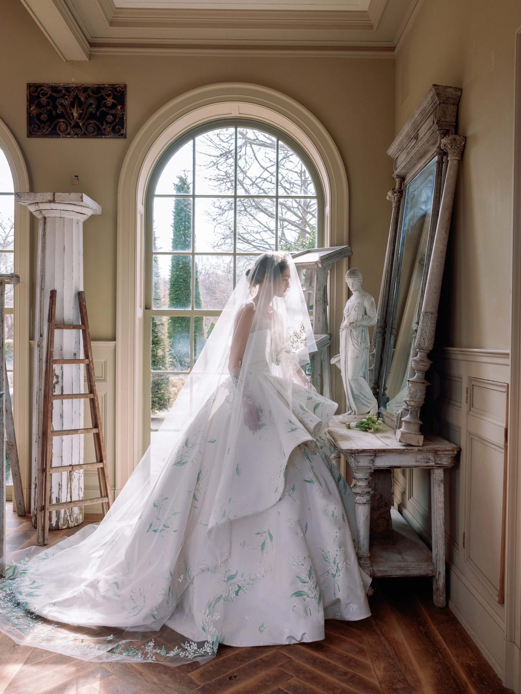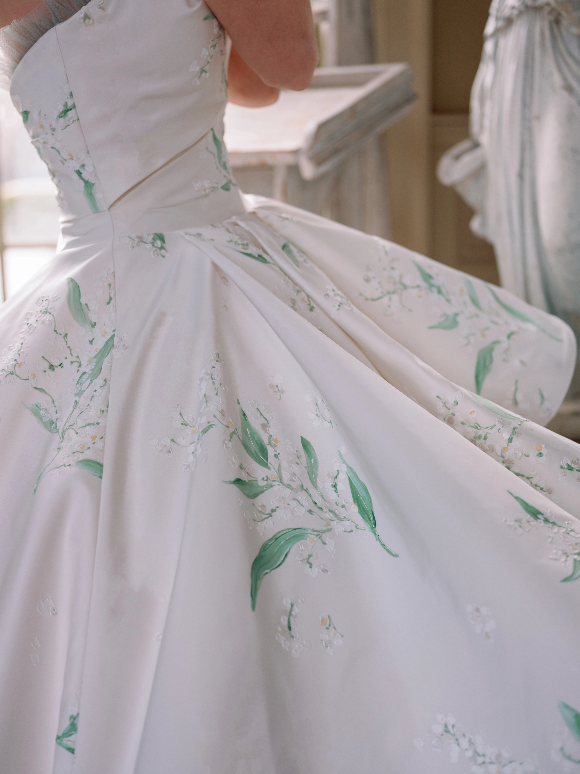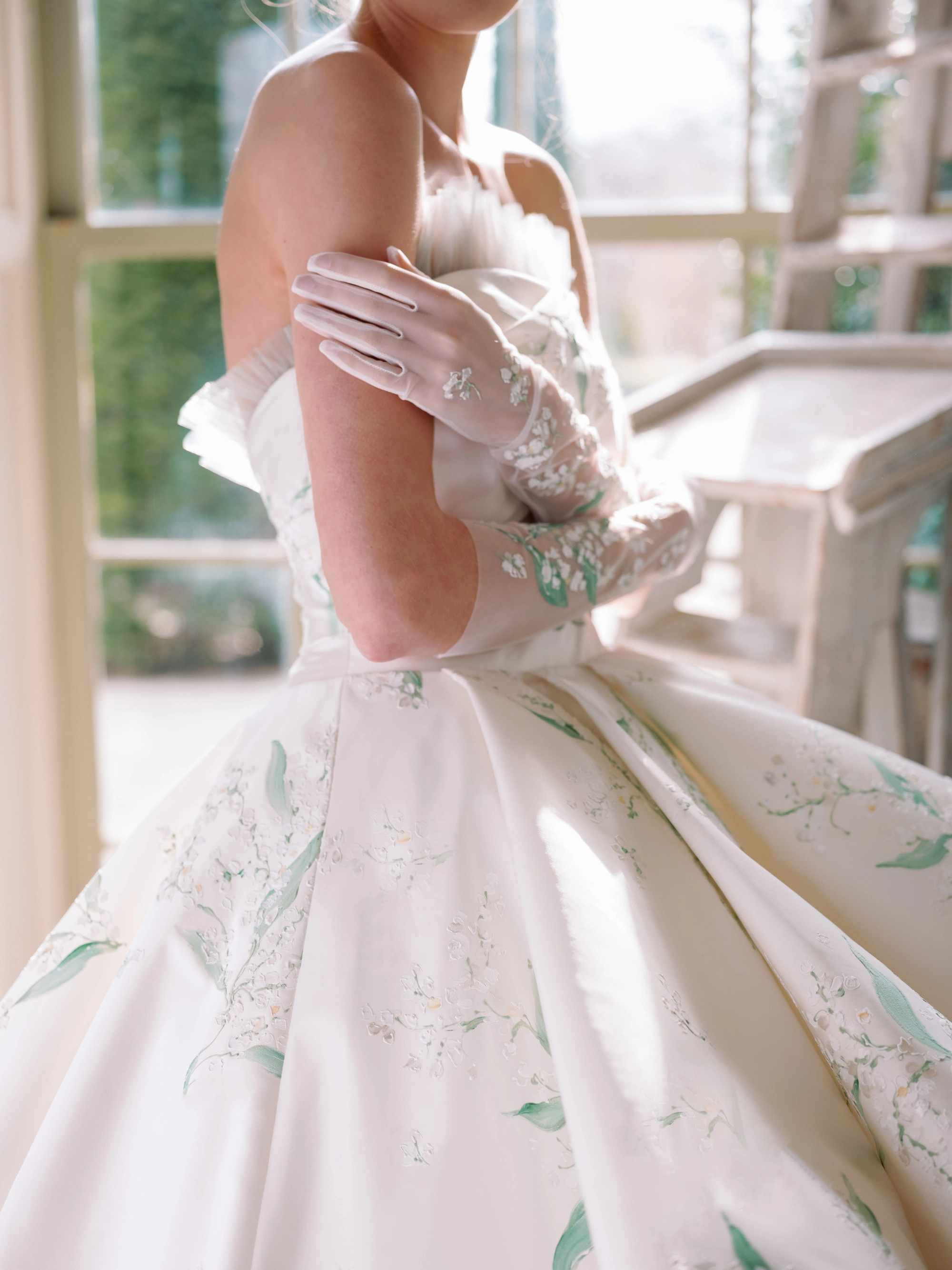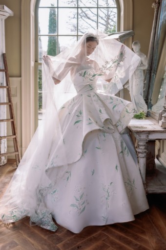 Lily of the Valley Radzimir gown, featuring a straight neckline with gathered tulle detail, a hand- draped bodice, and a dramatic layered oversized ballgown skirt with a cathedral-length train.