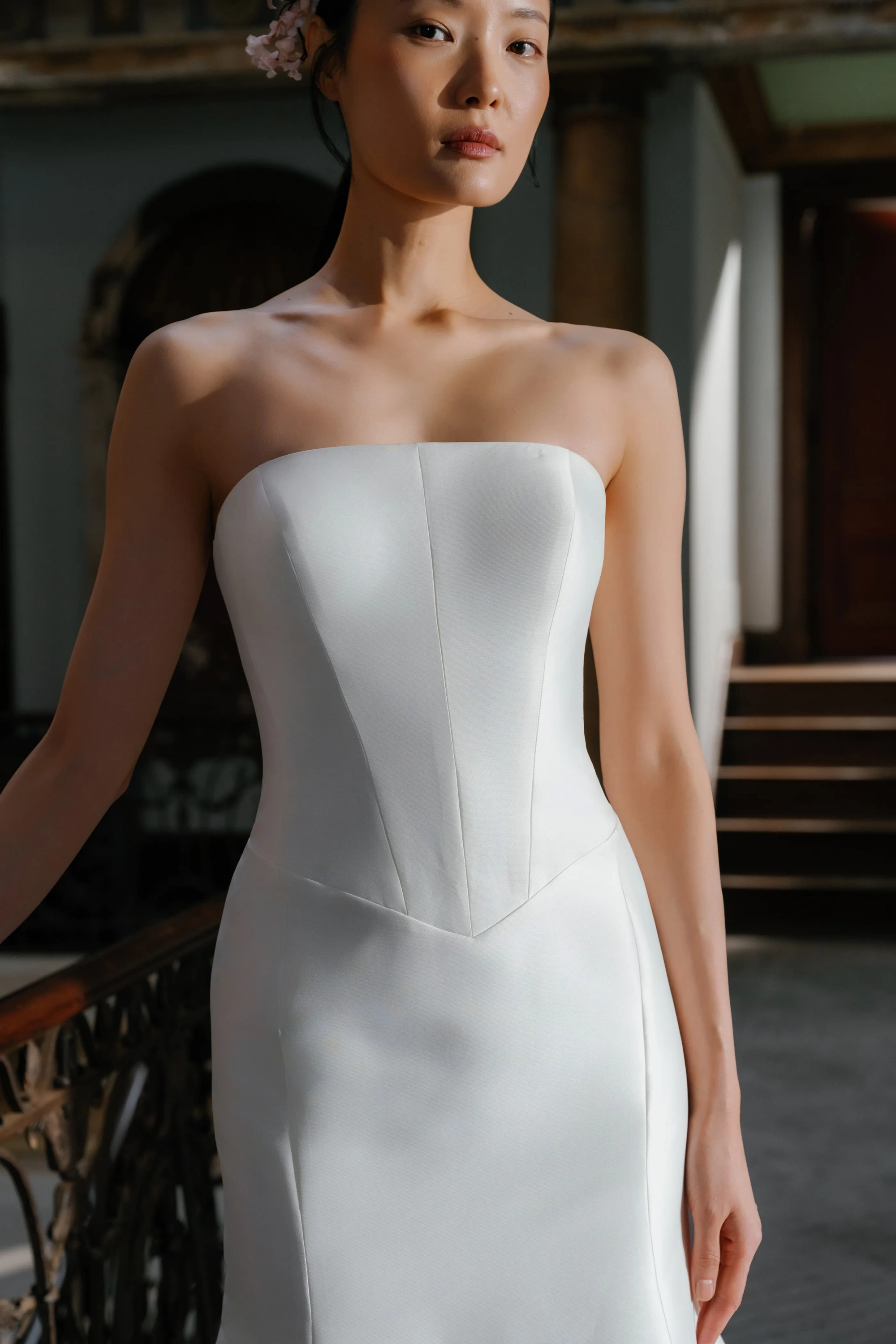 Italian Stretch Mikado straight neckline baby basque waist slim flare gown with seaming detail.