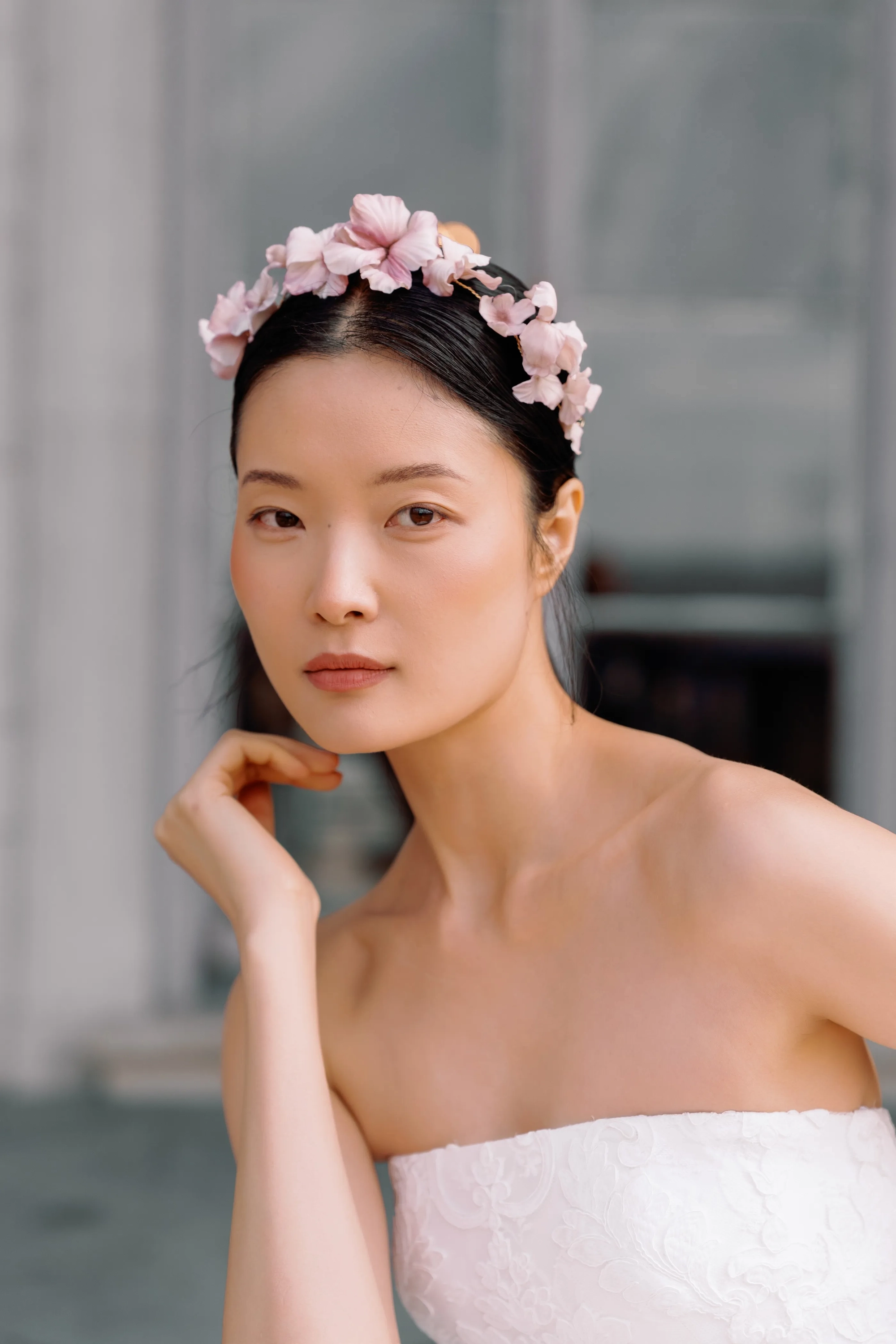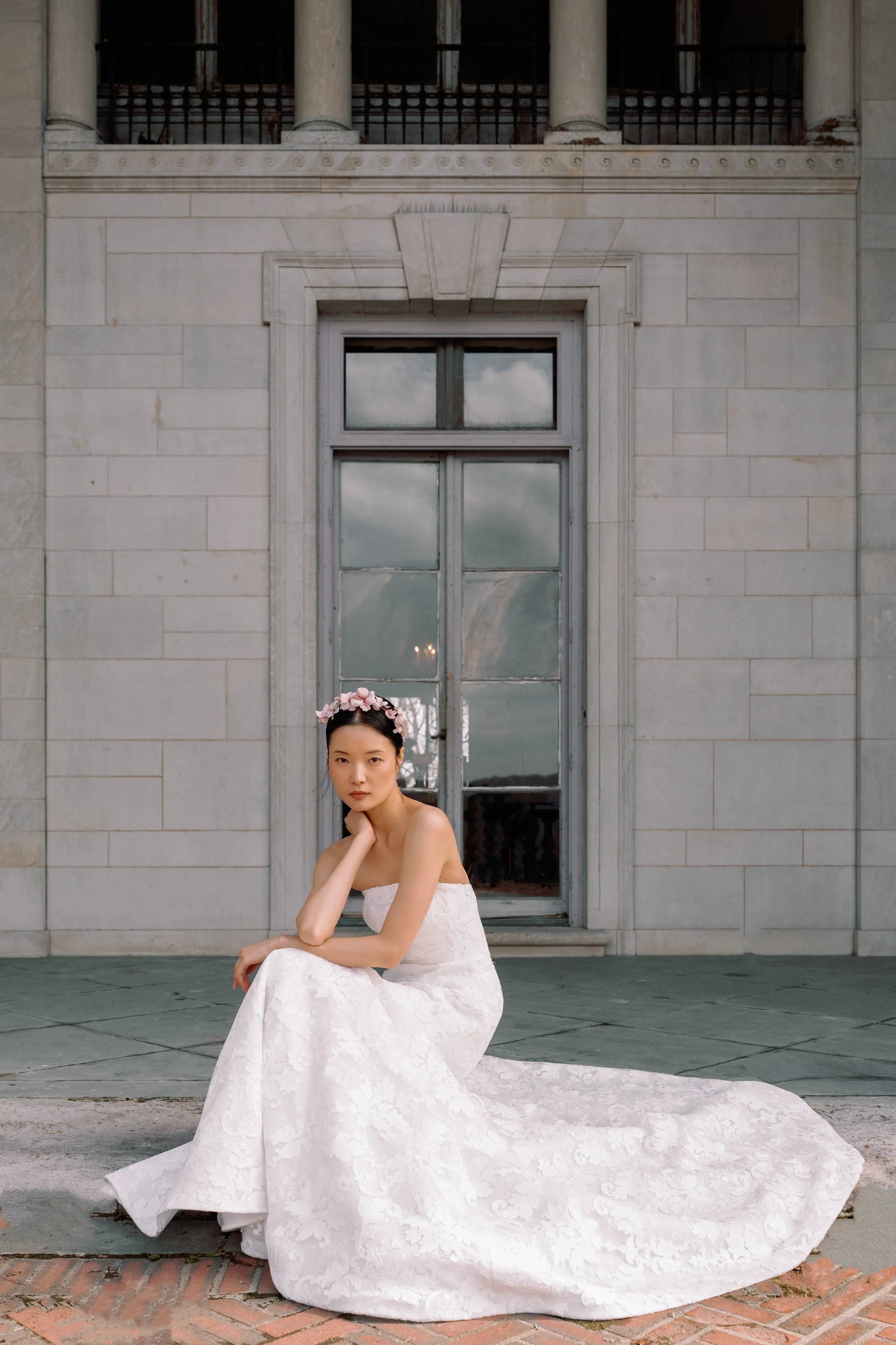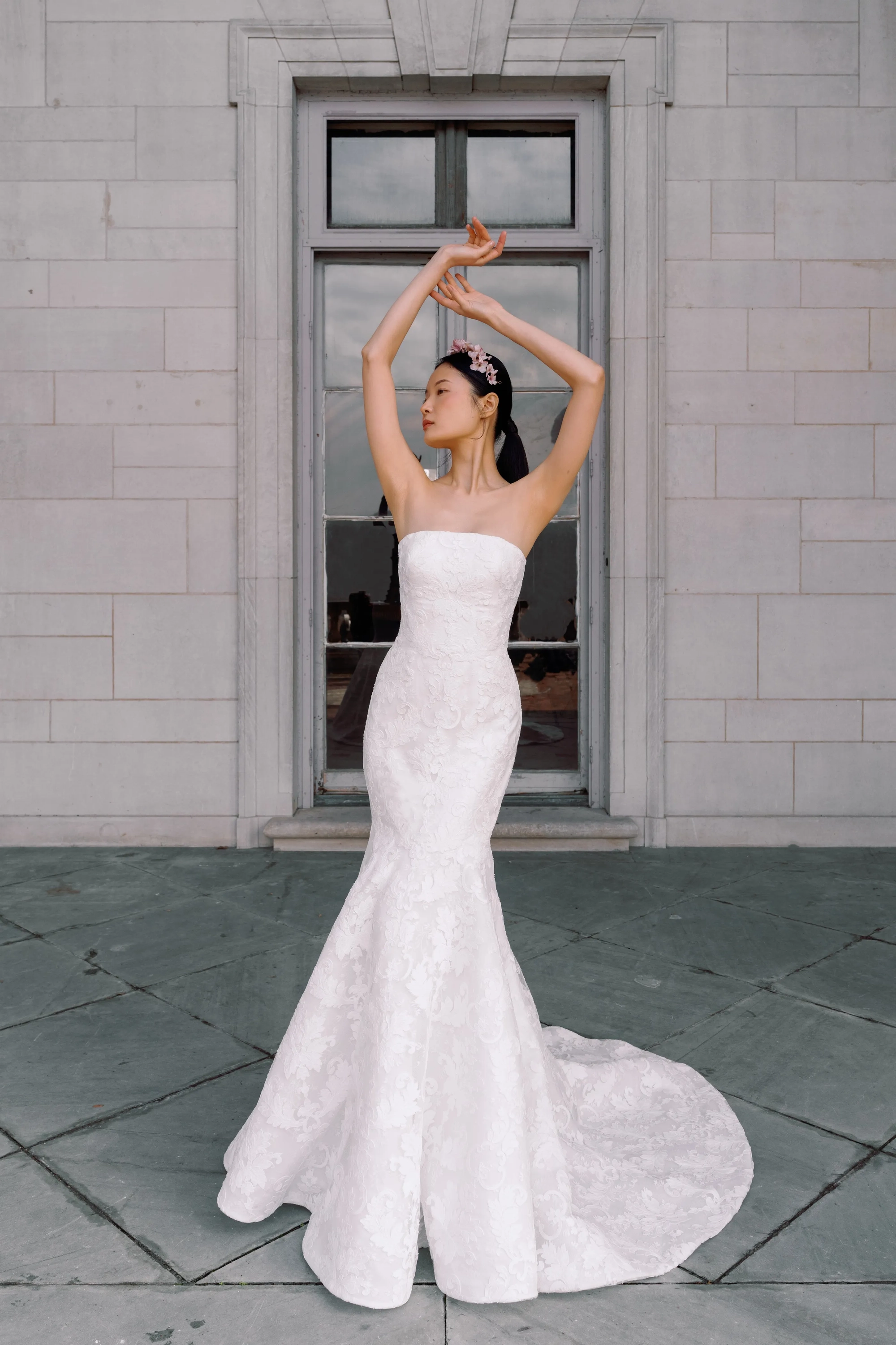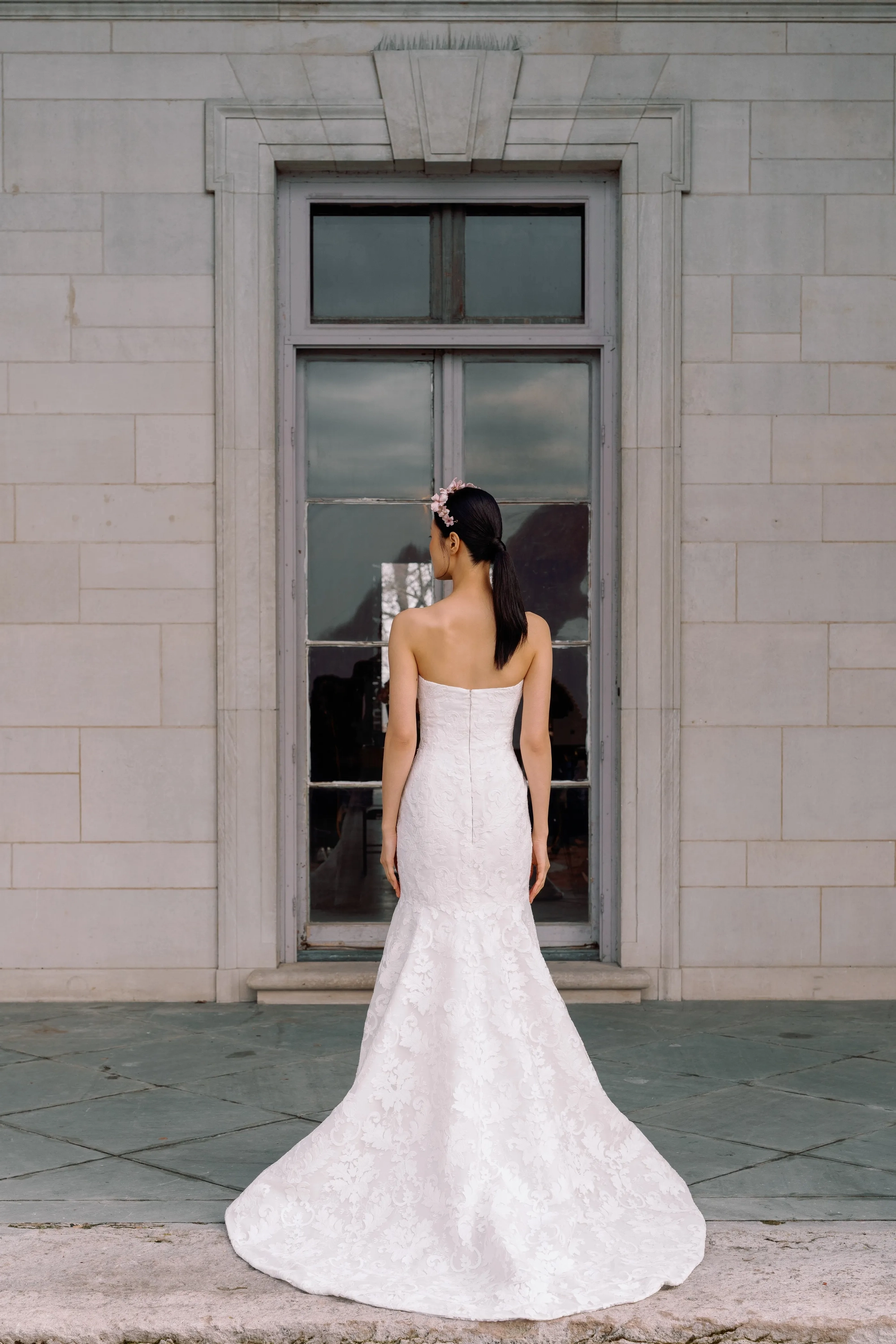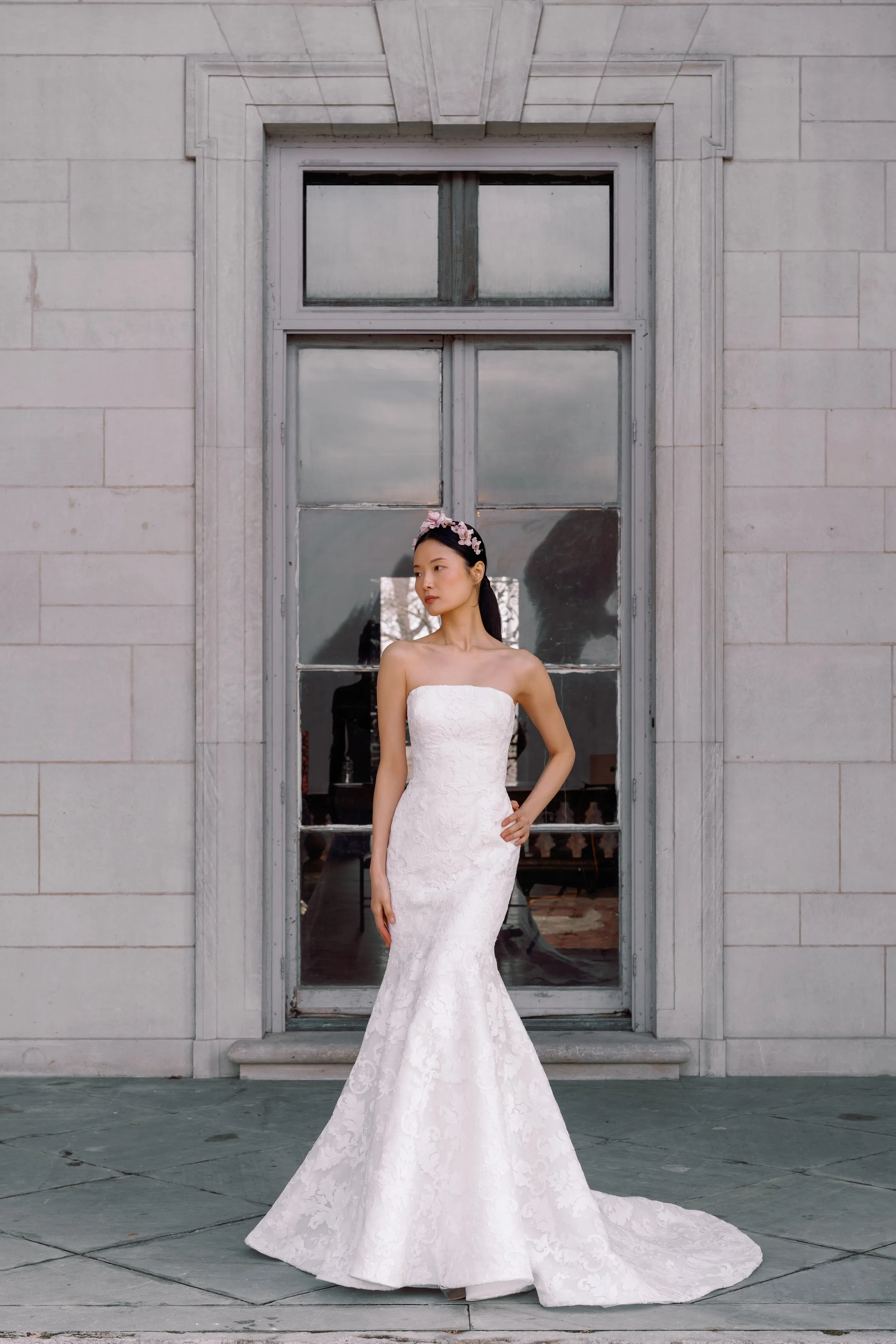 Embroidered leaf and medallion lace straight neckline slim flare gown.