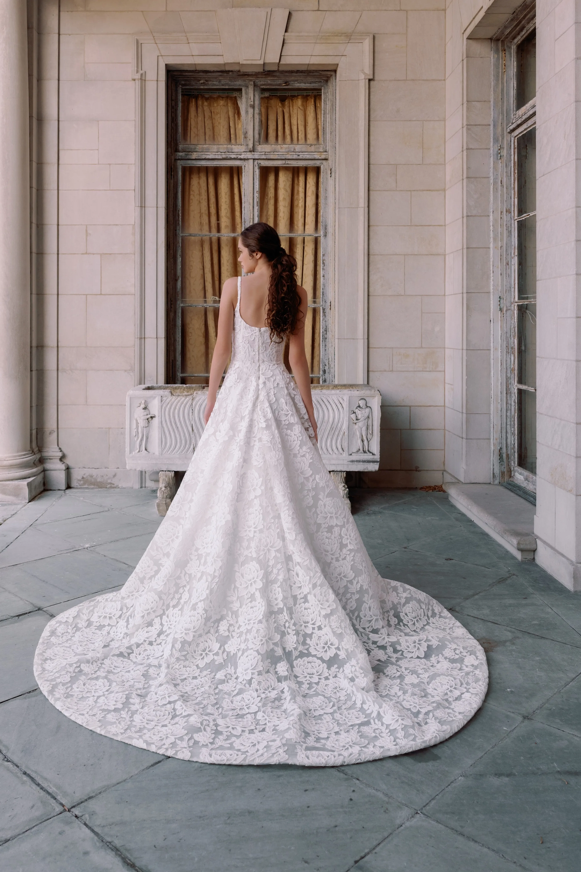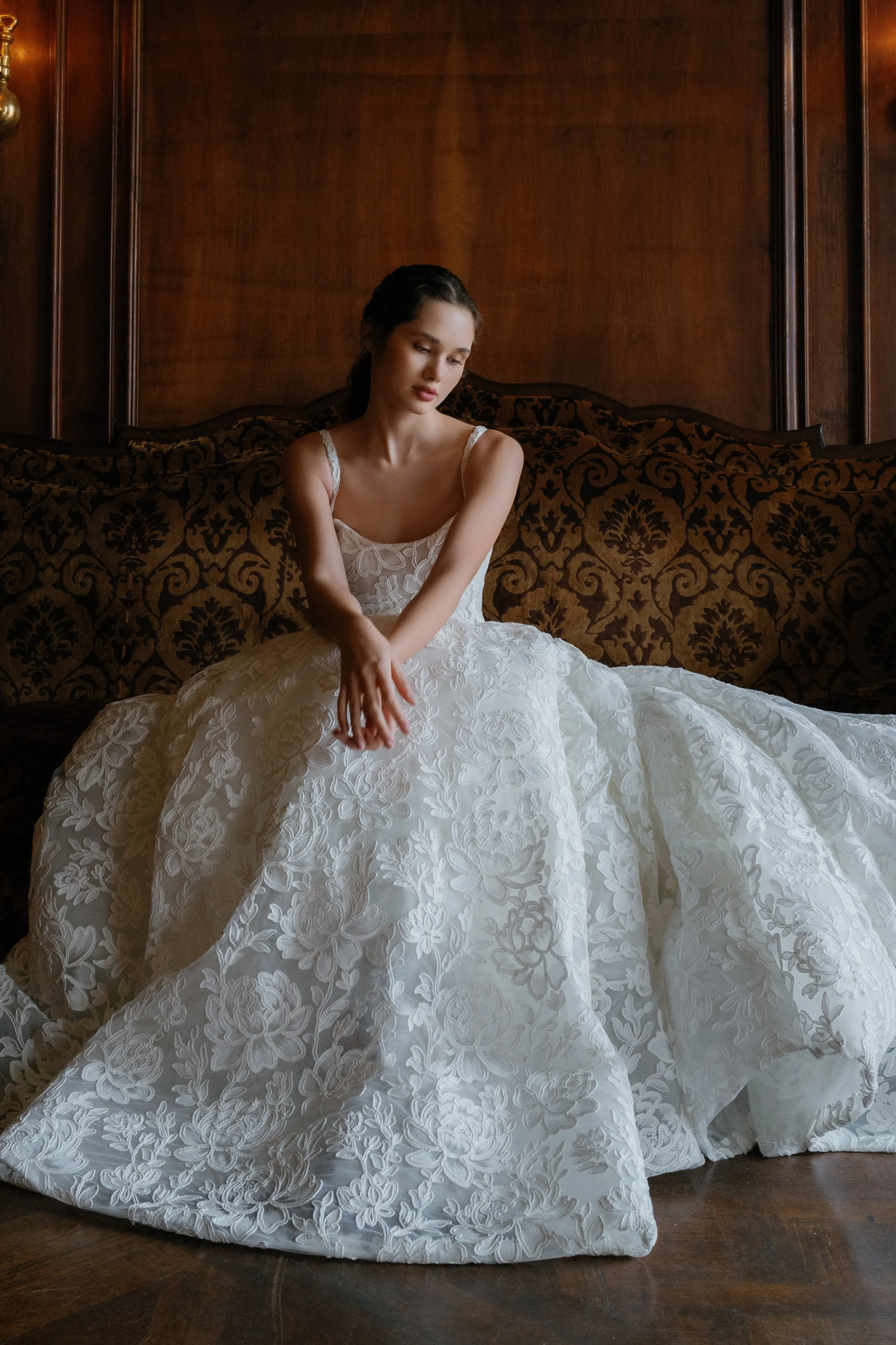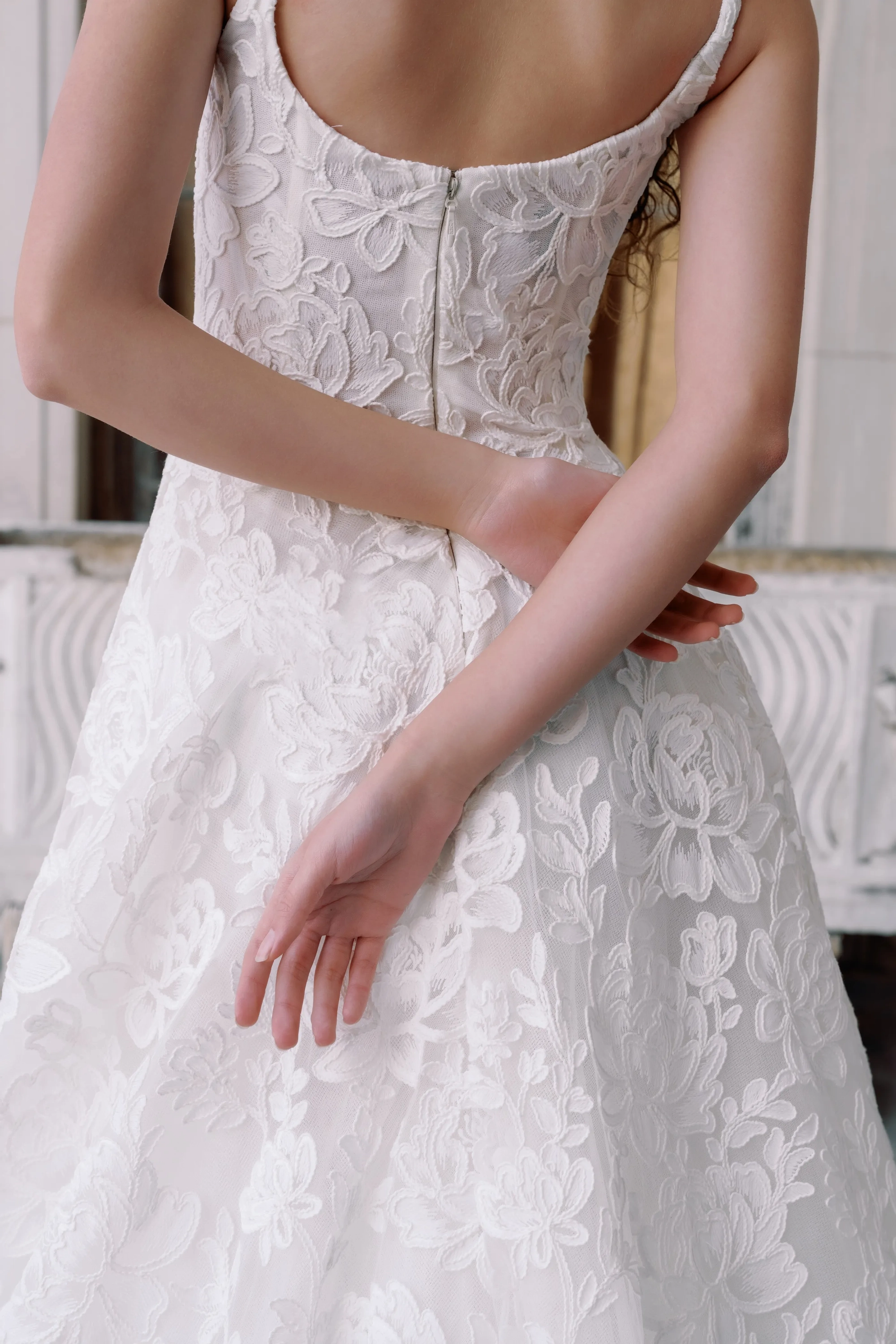 Embroidered floral lace scoop neckline with thin straps, slight drop waist, and soft cone silhouette skirt.