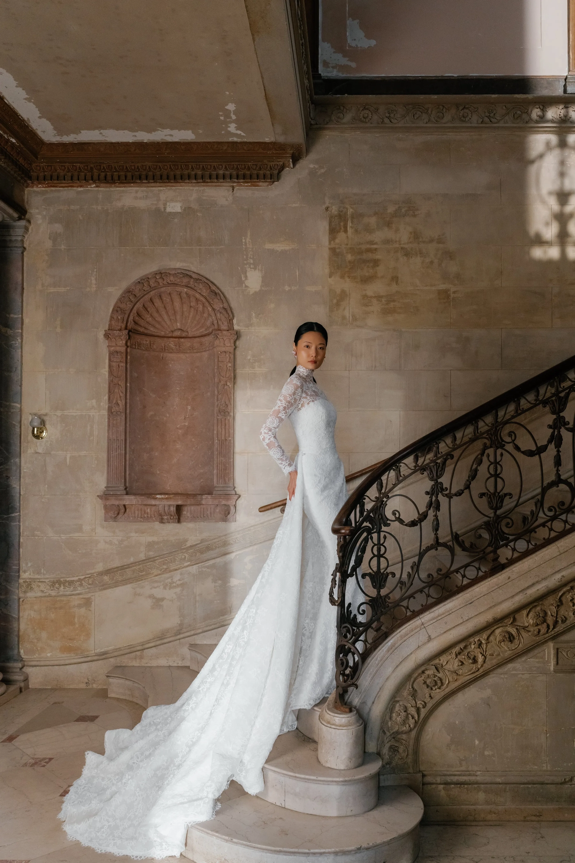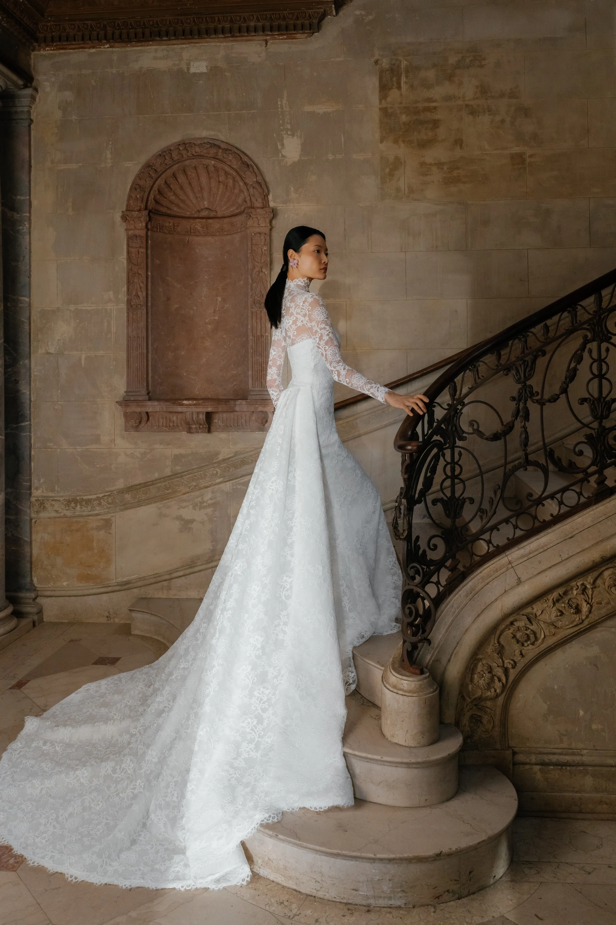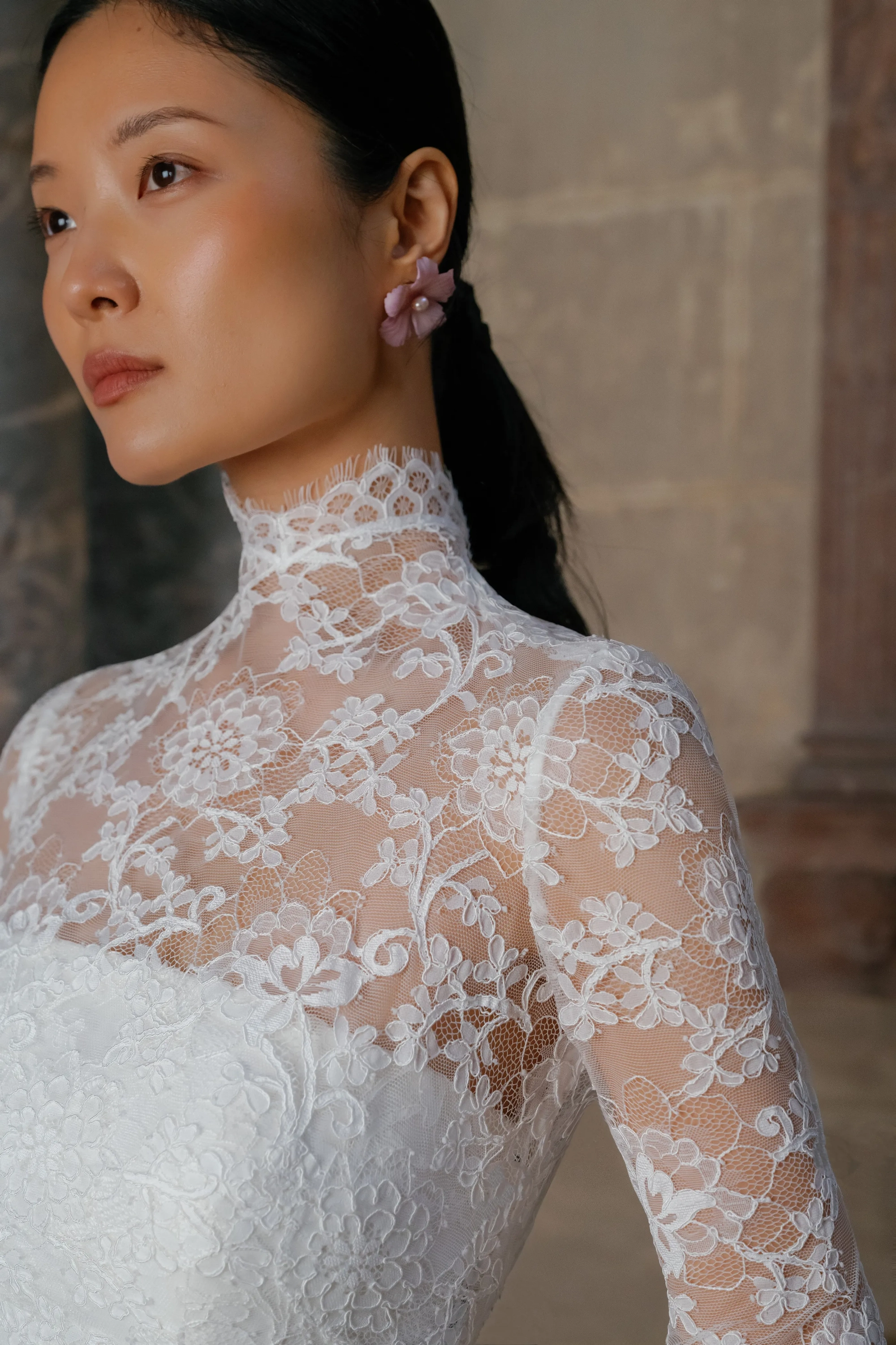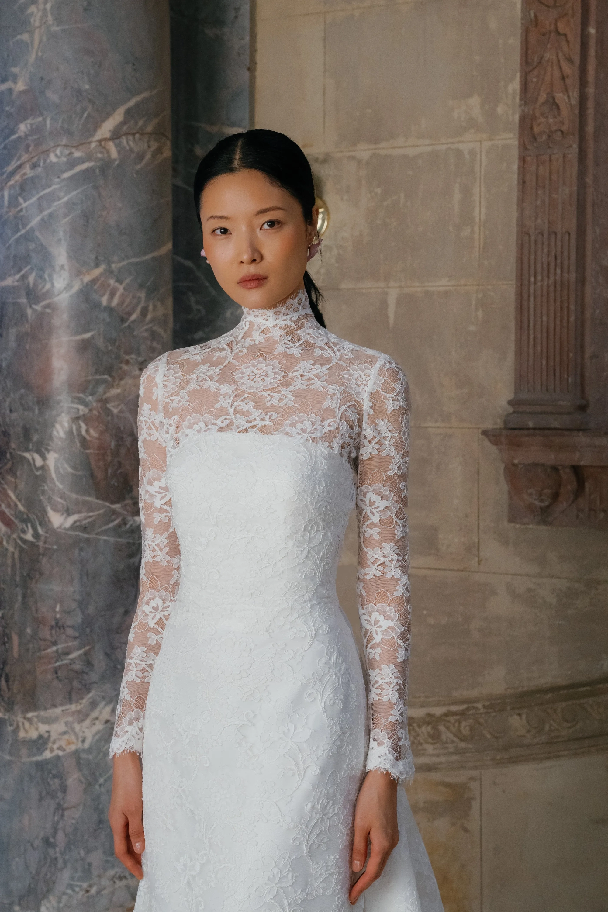 Alencon lace high neck detachable bolero over straight neckline slim flare gown and detachable lace overskirt.