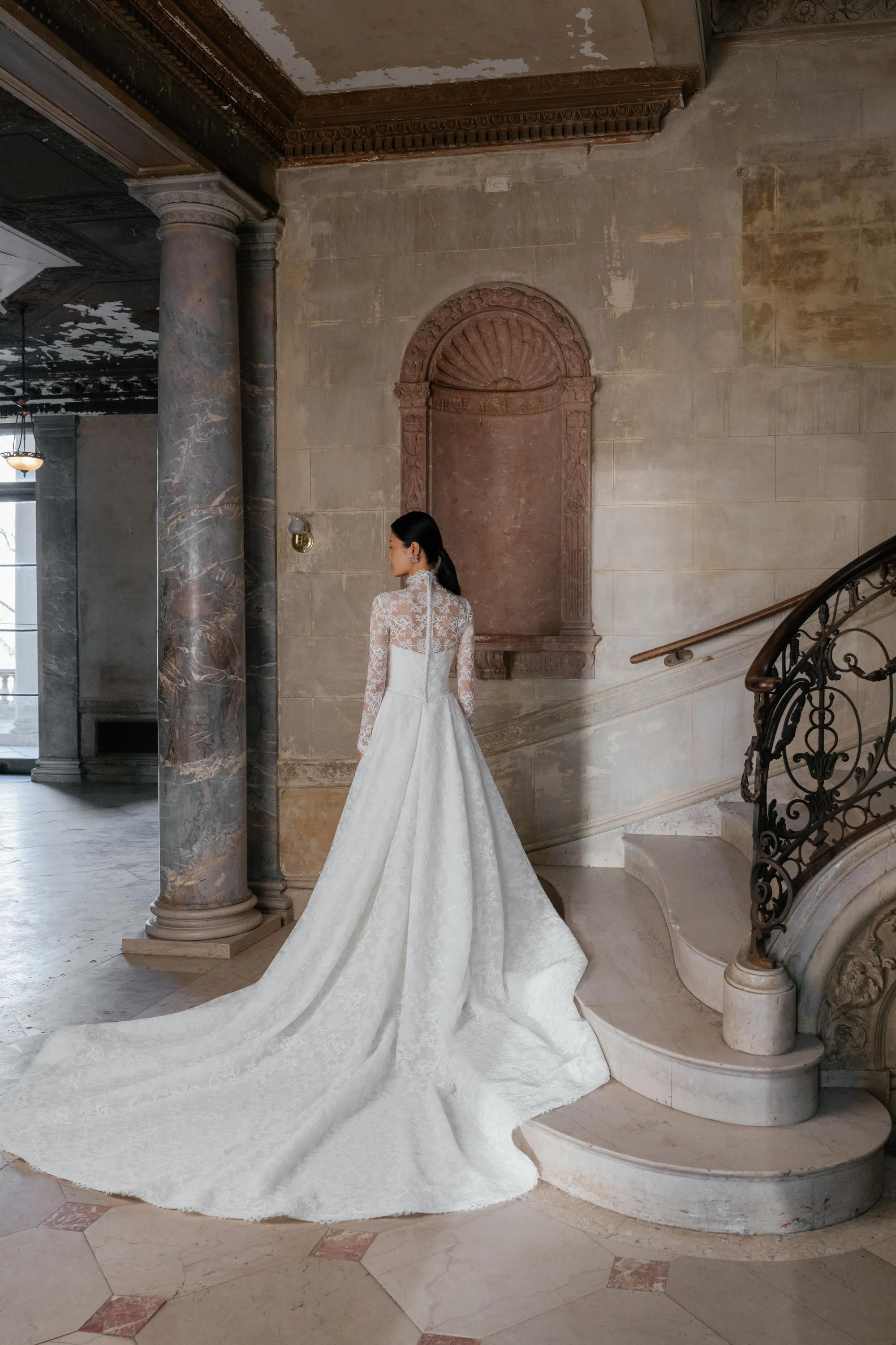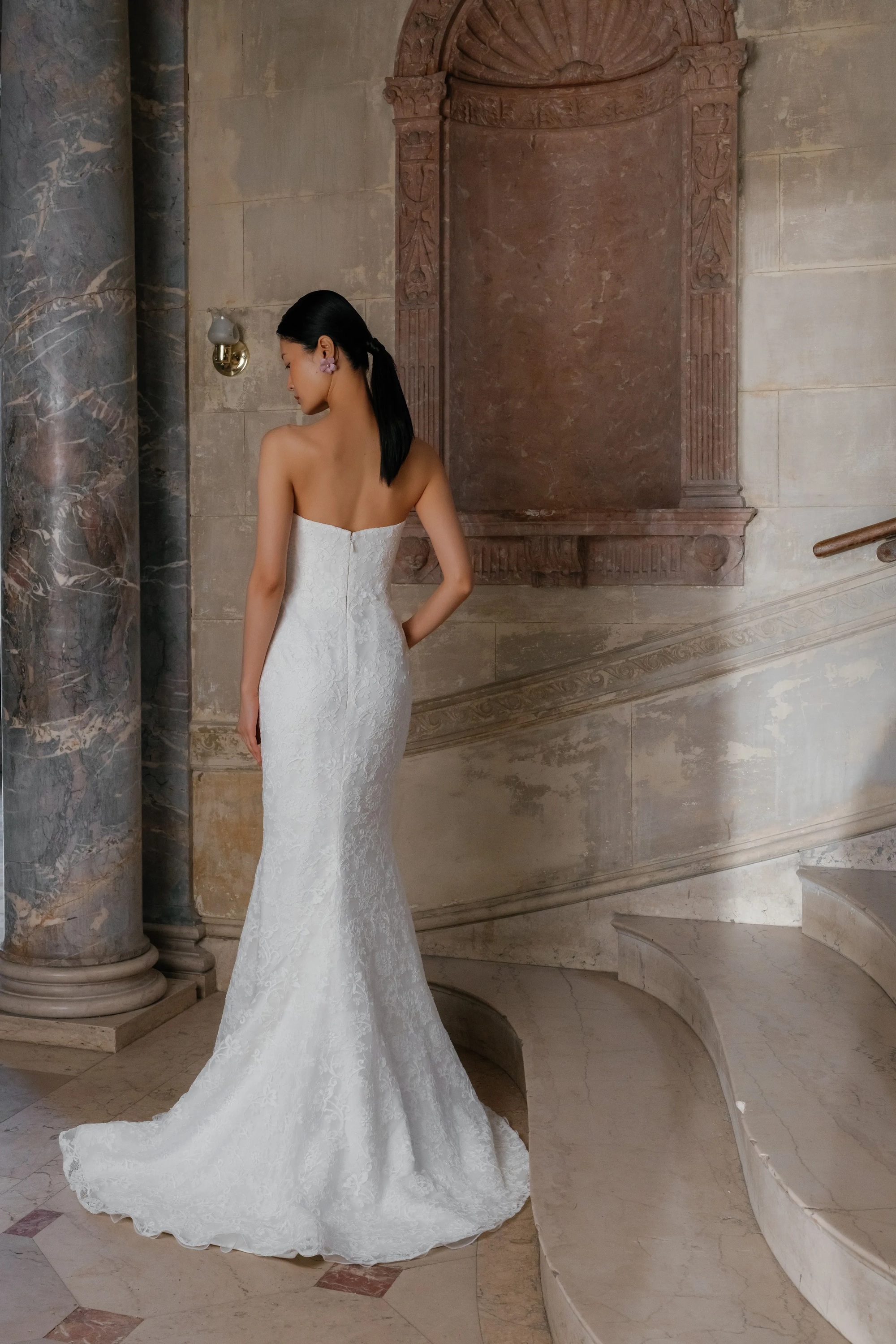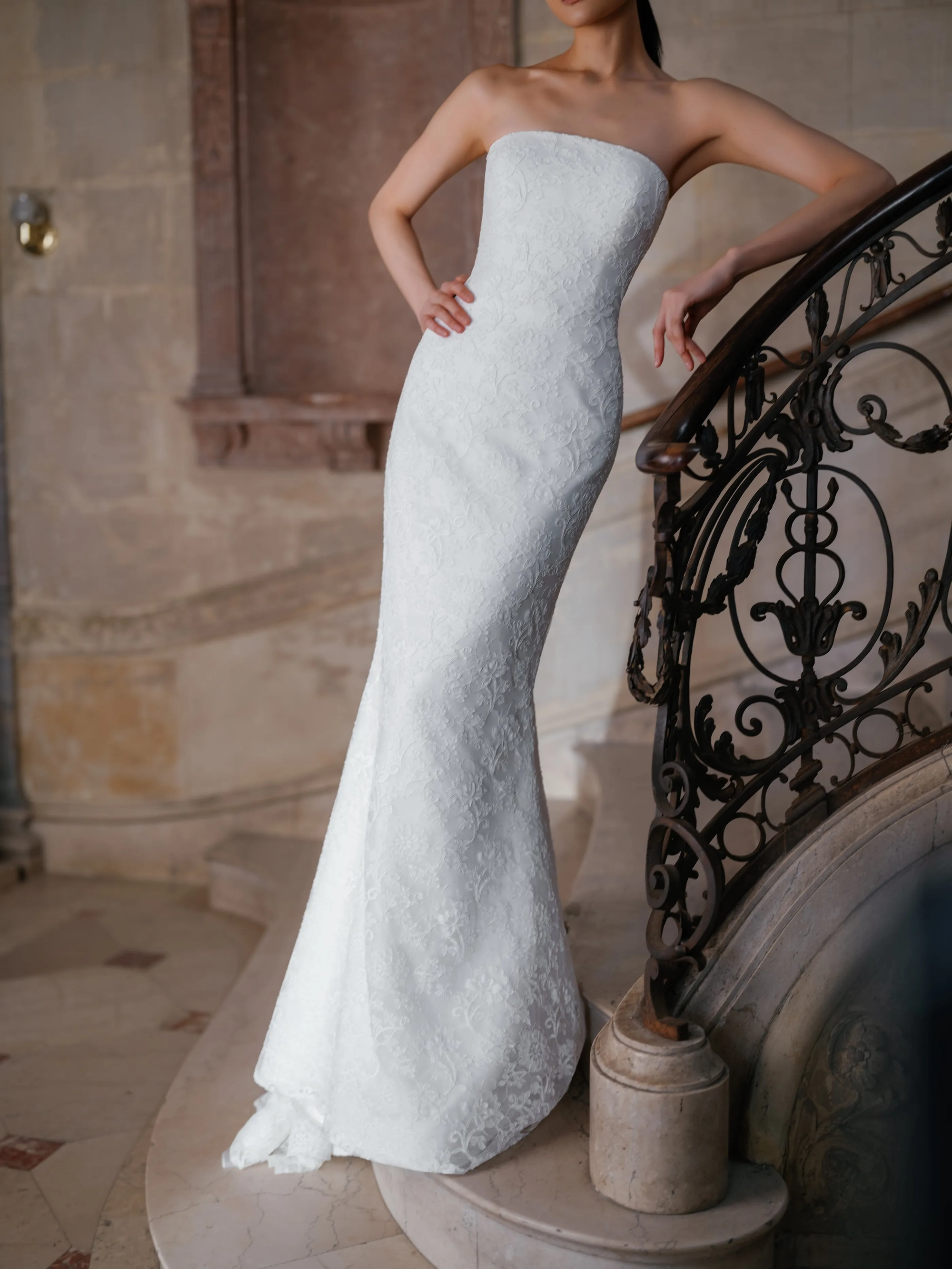 Alencon lace high neck detachable bolero over straight neckline slim flare gown and detachable lace overskirt.