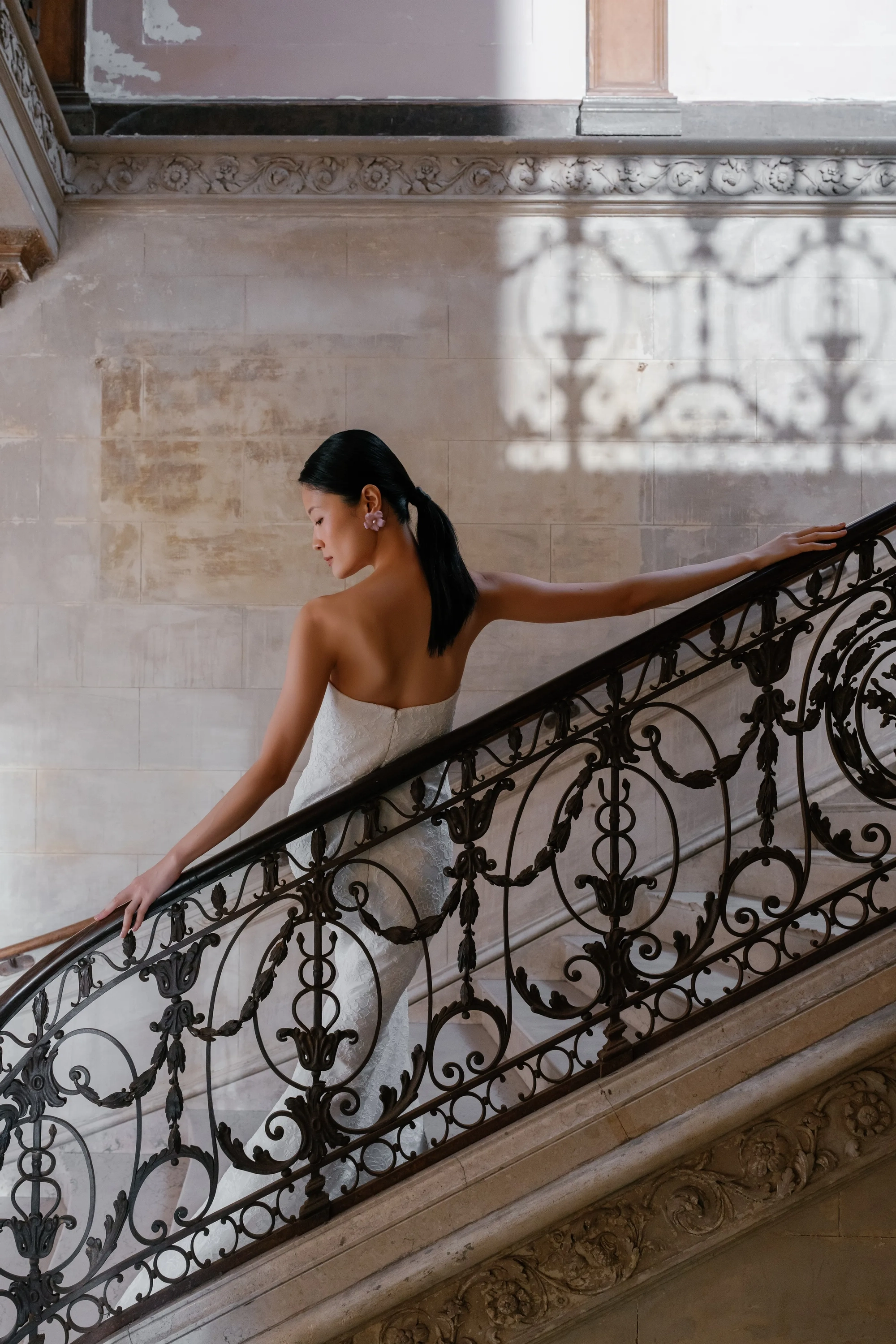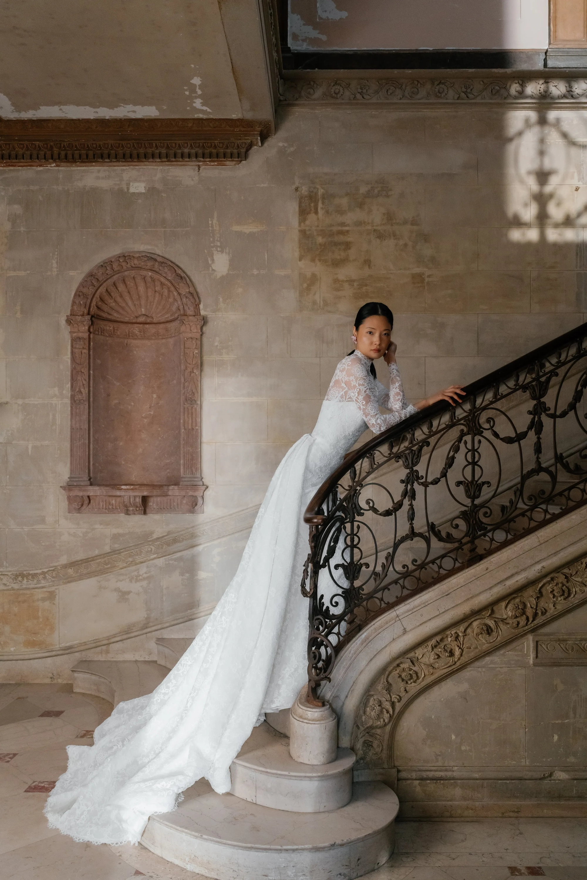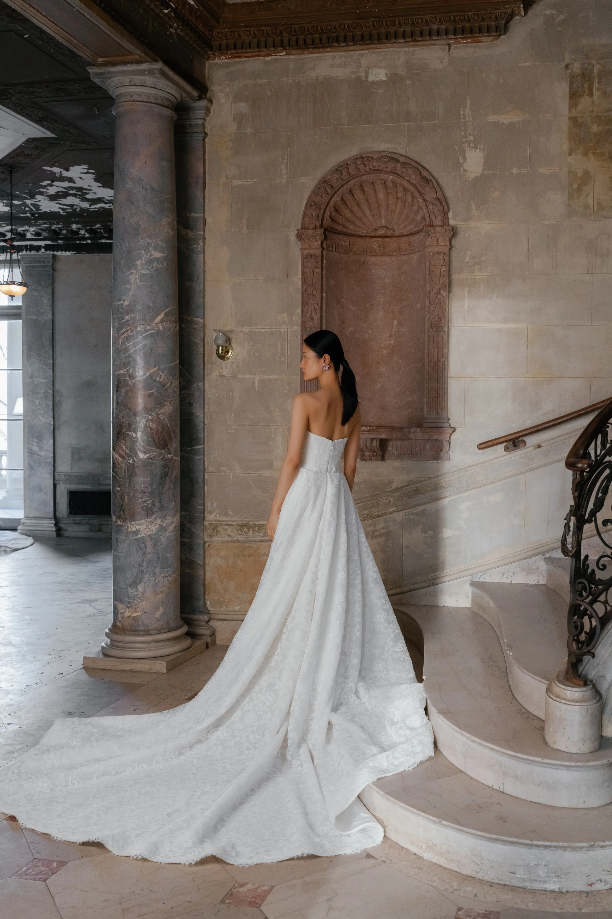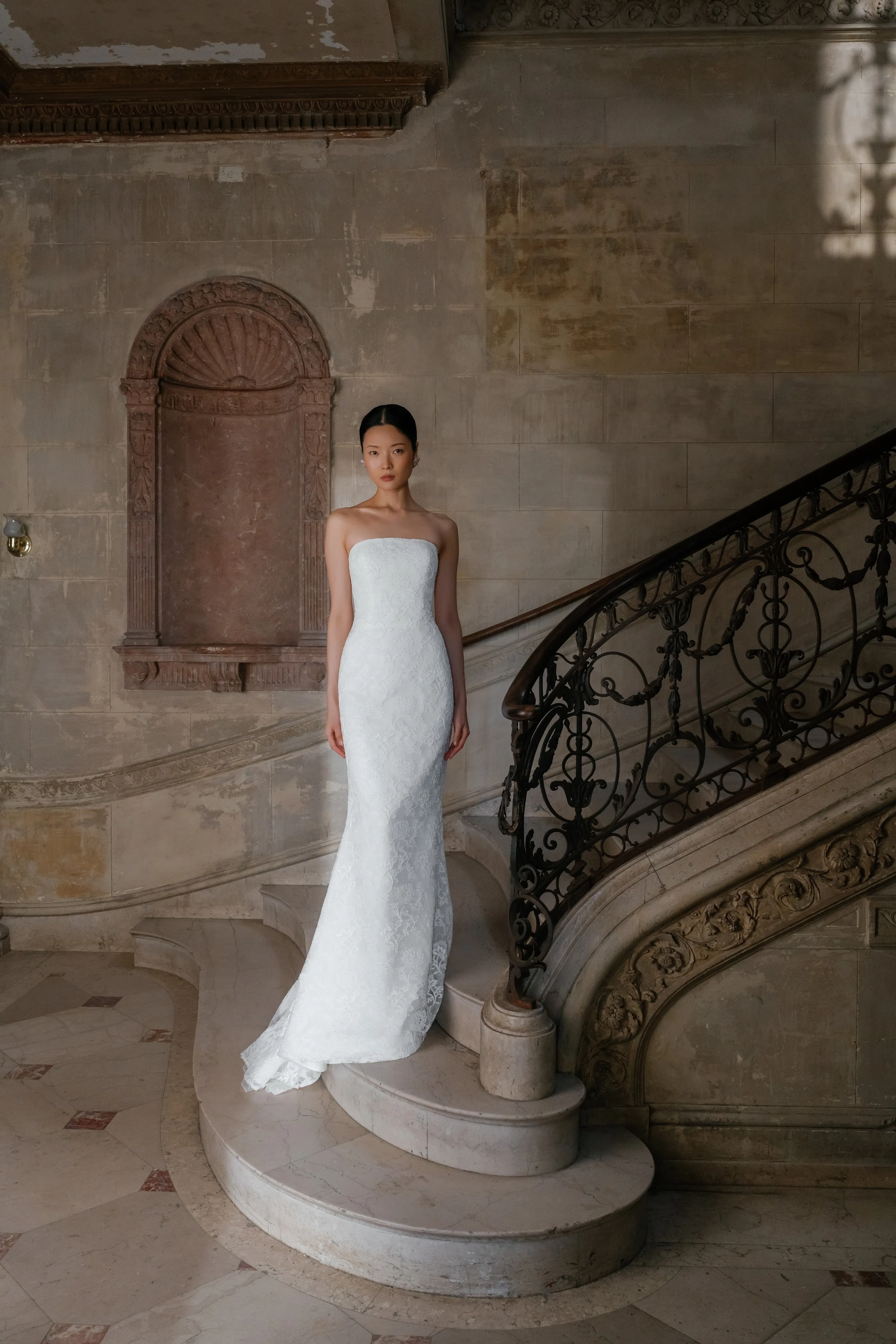 Alencon lace high neck detachable bolero over straight neckline slim flare gown and detachable lace overskirt.