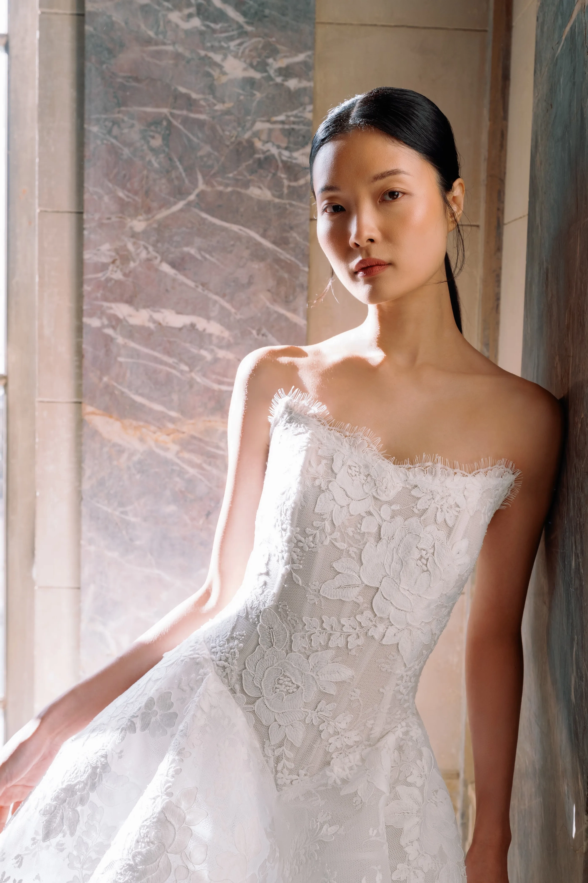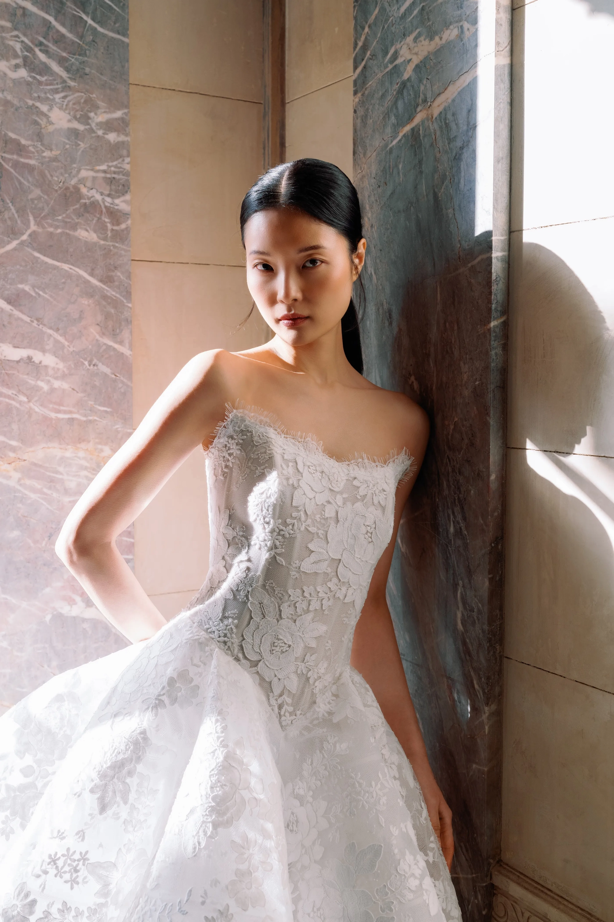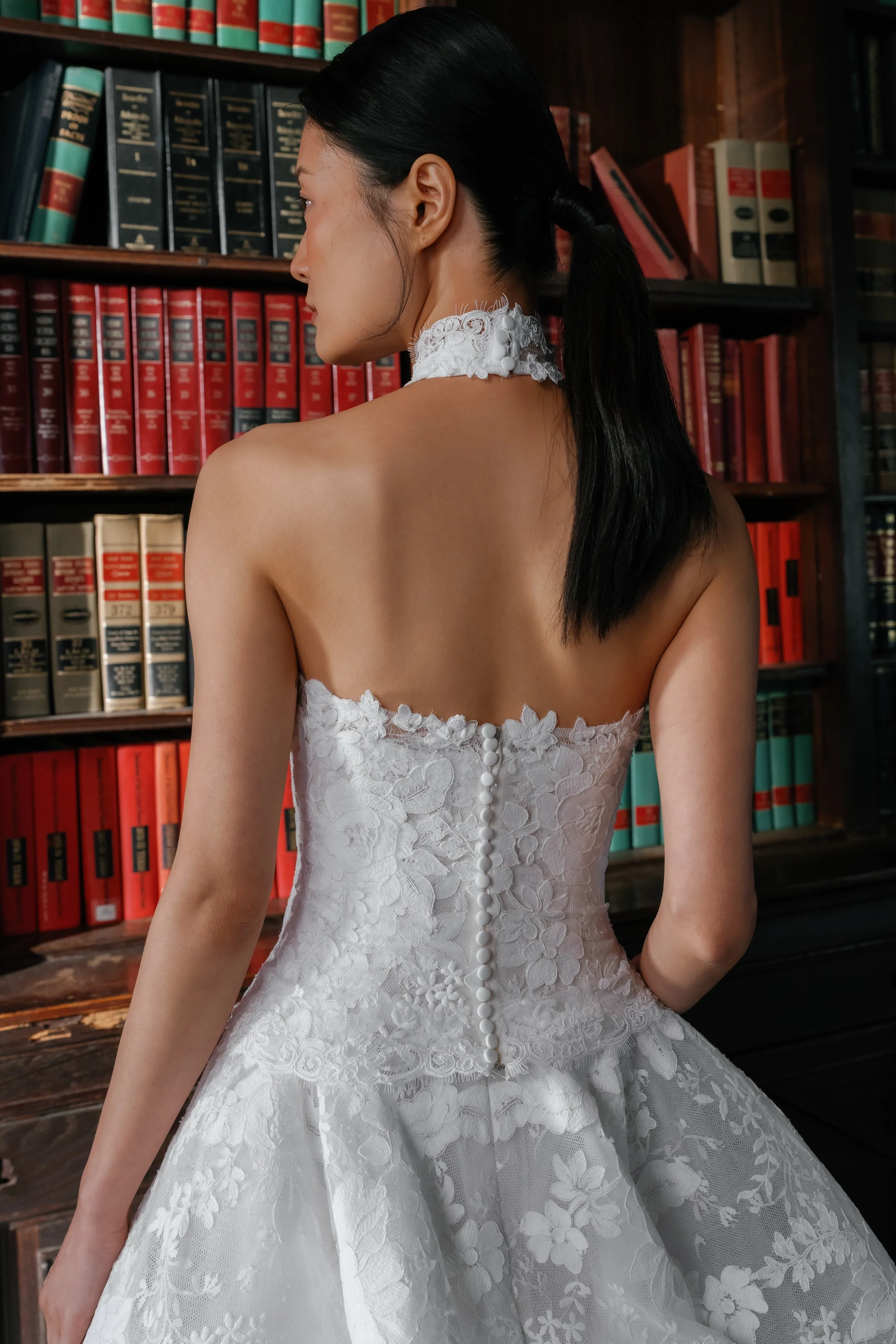 Embroidered lace cat-eye neckline, basque waist, and a dramatic coned silhouette.