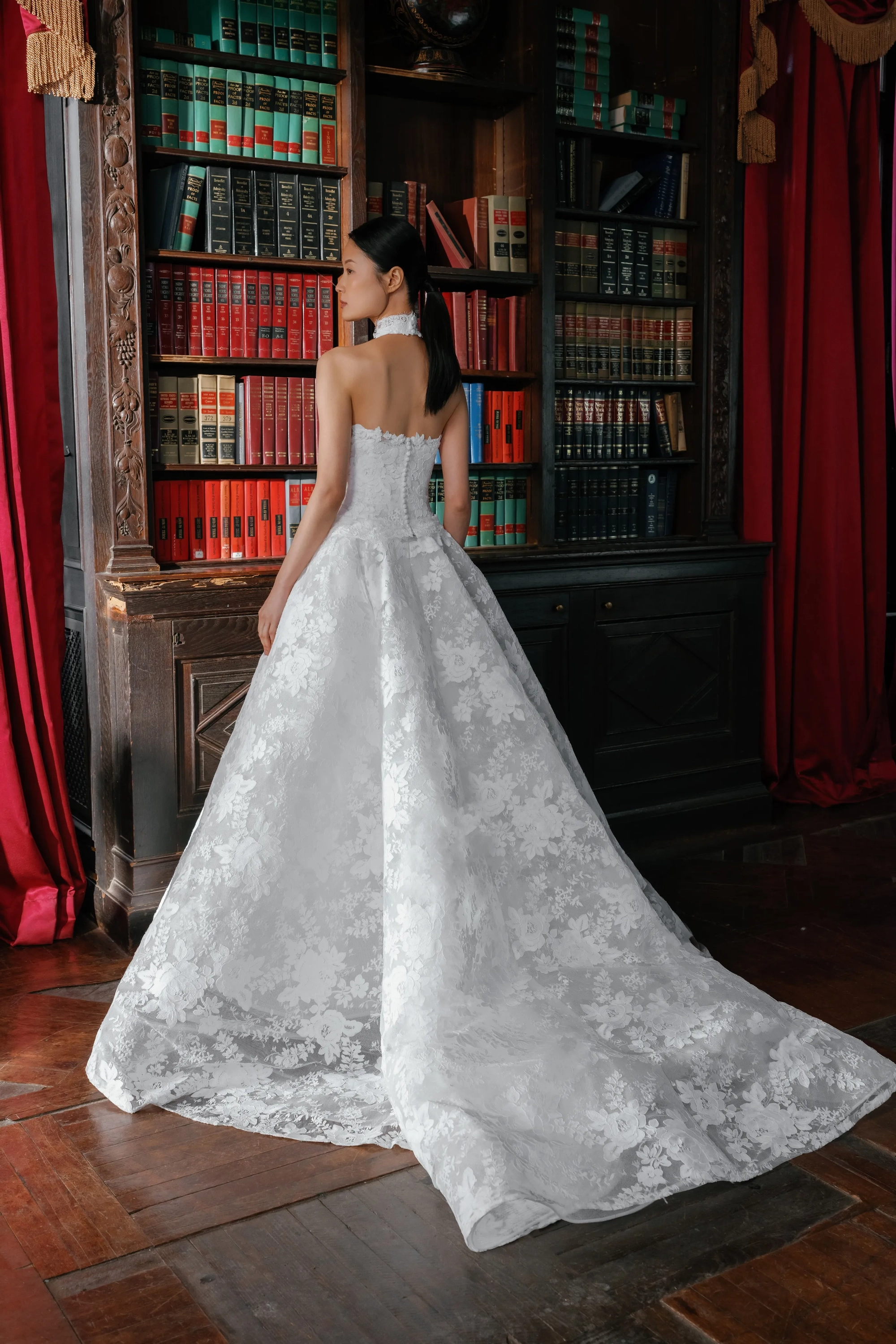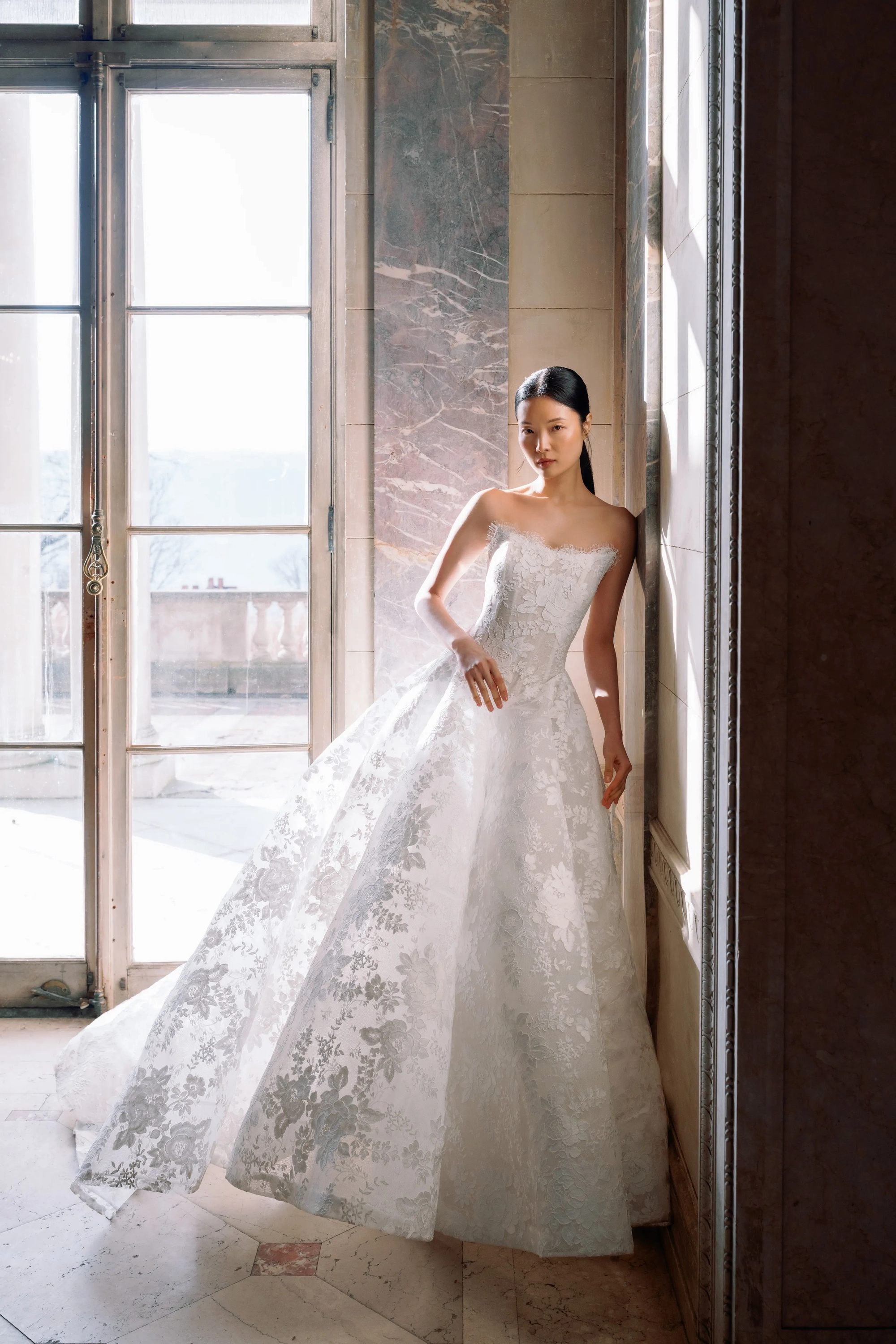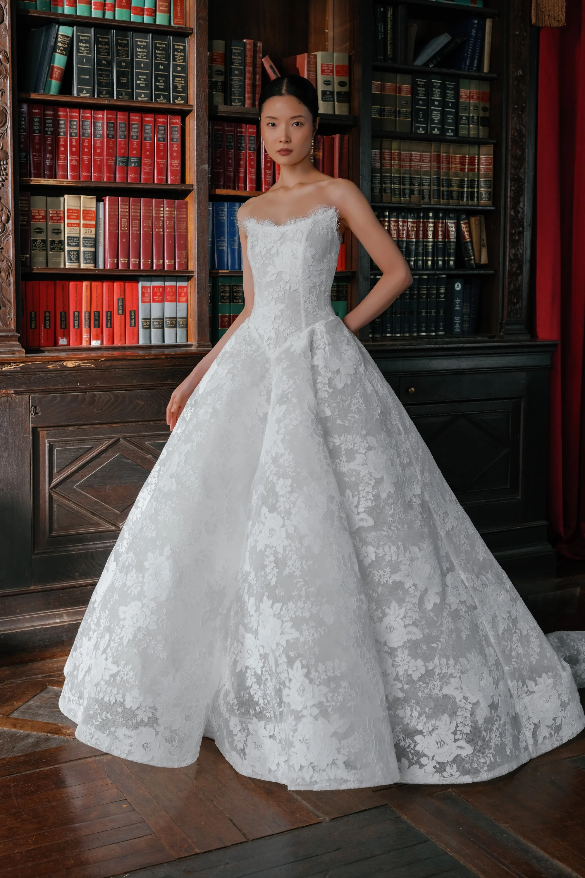 Embroidered lace cat-eye neckline, basque waist, and a dramatic coned silhouette.